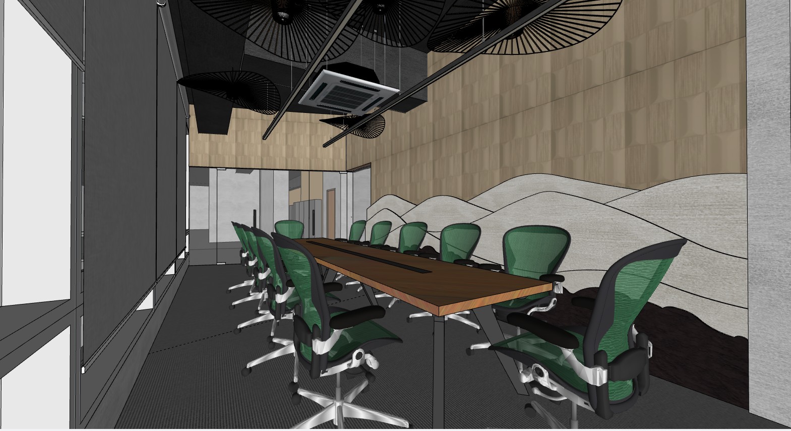 render a modern conference room with an inviting atmosphere the wall has pu stone in beige color the chairs are a sleek design with deep neutral green mesh and black accents the table has a contemporary finish with a smooth brown surface the wall features a textured geometric white panel design imitating hills with backlight under each layer soft ambient lighting creates a cozy welcoming environment the floor is a charcoal gray complementing the room s modern aesthetic