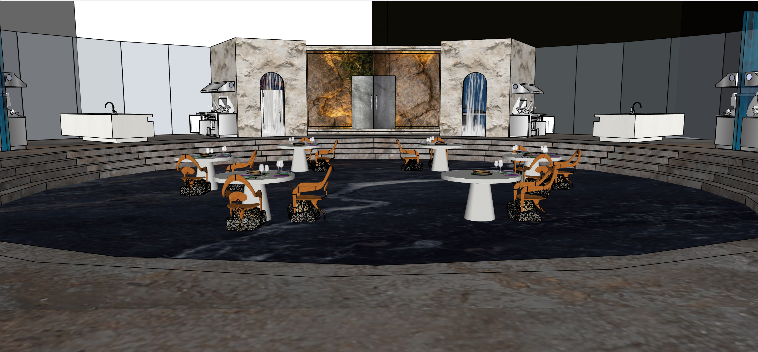 faux rustic wooden chairs marble floor stone walls stone tables steel door steel kitchen ware waterfall stone stairs dark warm lighting