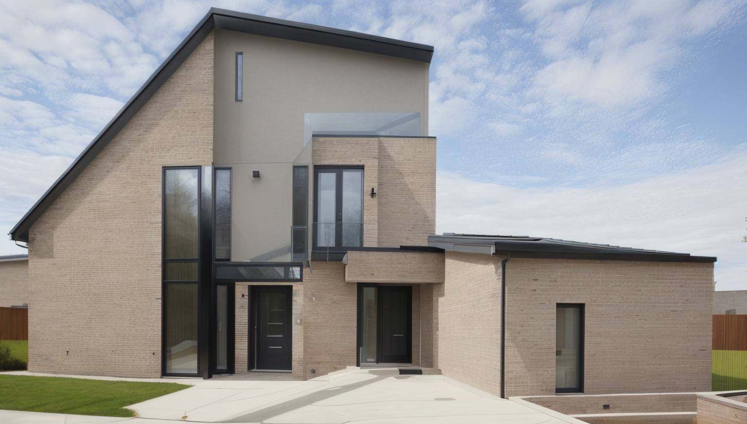 a beautiful two story mediterranean villa with white walls and terracotta roof tiles shuttered windows in soft gray a backyard featuring an elegant turquoise pool with a small waterfall a cozy seating area with white cushions on dark wood surrounded by lush green grass tall trees with deep green leaves lounge chairs in beige under a large tan umbrella the atmosphere is serene and luxurious under a clear blue sky architecture
