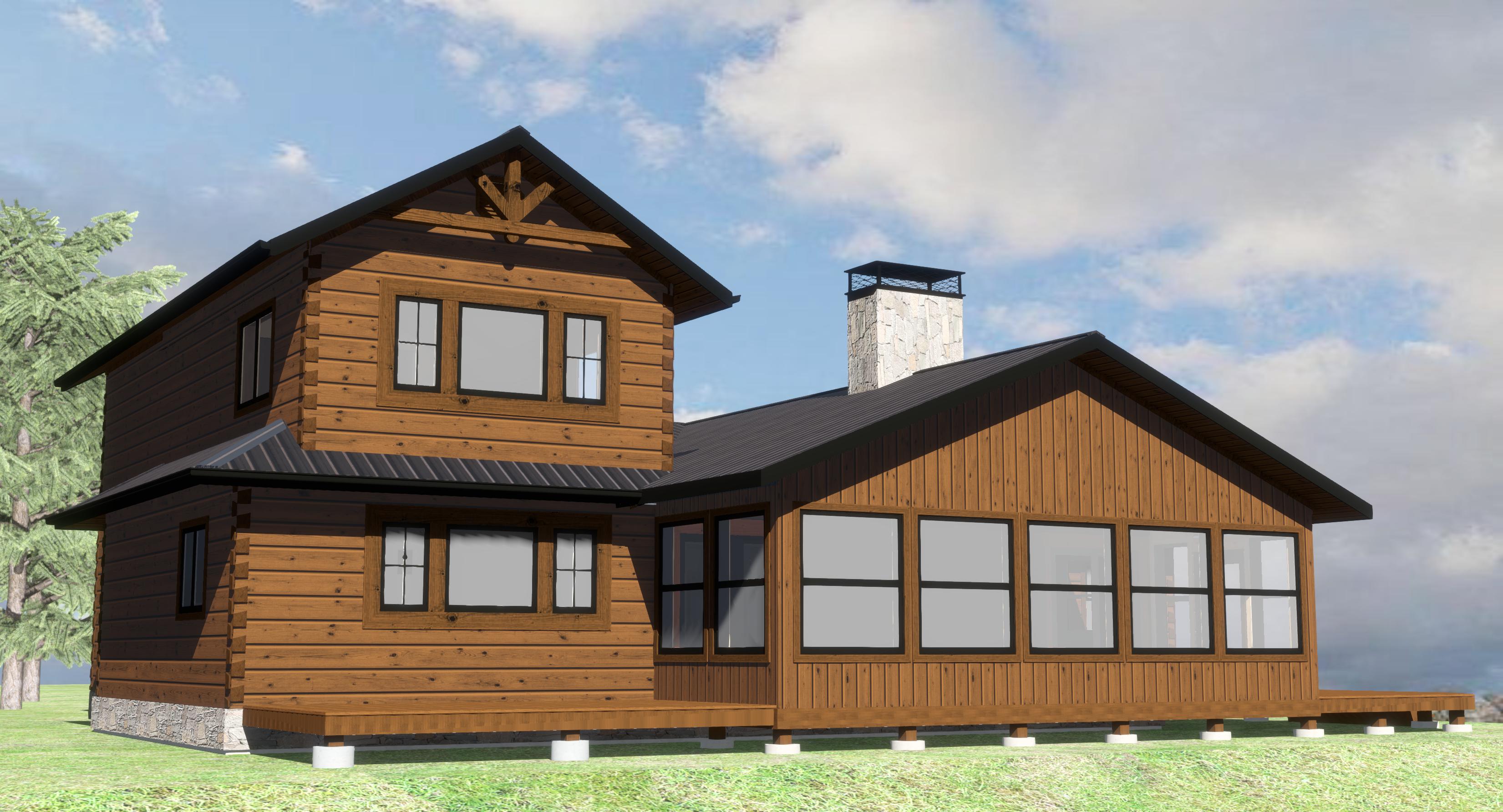 make this look realistic add some trees found in ontario in the background add some plants and stone paved path in the foreground add some smoke to the chimney steel roof on the house its a nice autumn day