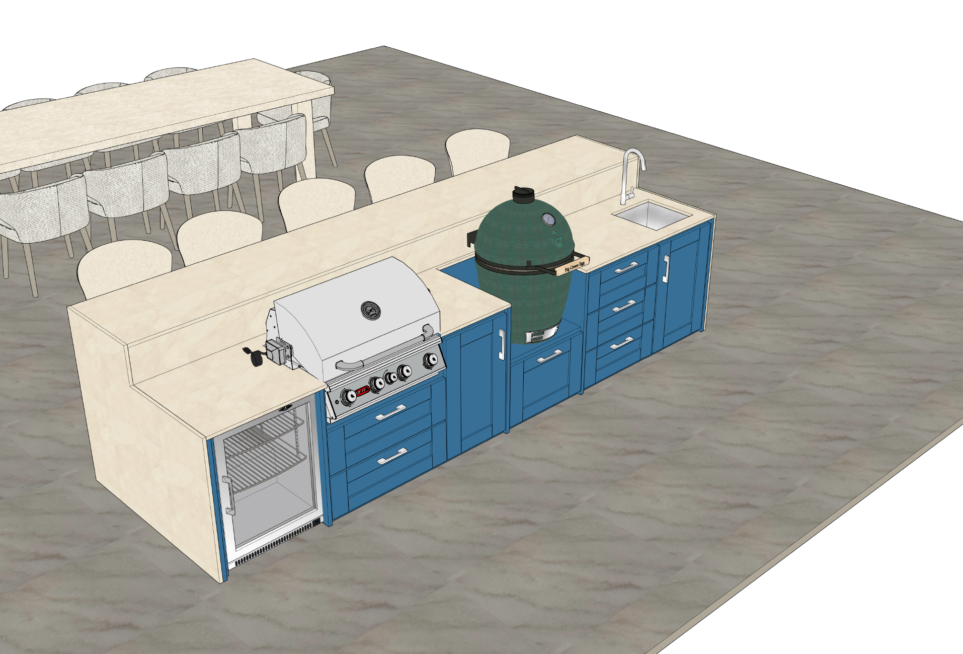 do not change any colours on the kitchen do not adjust any appliances from the kitchen do not change any part of the worktop or kitchen there needs to be a glass balustrade to the right of the kitchen and table there is a grass garden at a dropped level to the right the patio needs to be a cream with very faint veins running through the patio