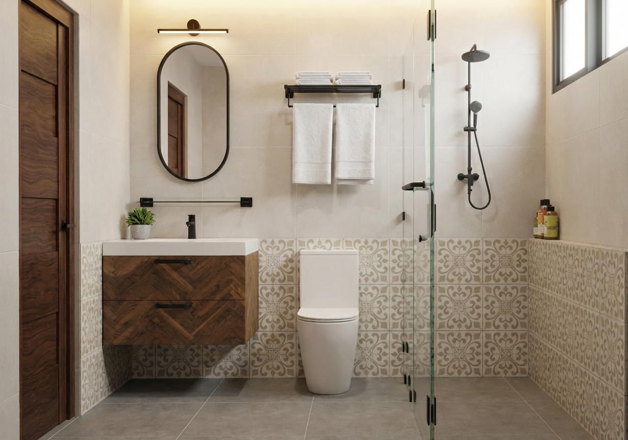 studio con armadio in legno rovere naturale scrivania in rovere e gamba cromata sedie di colore verde salvia scuro tavolino a destra di colore blu scuro le pareti sono bianche di fianco alla scrivania ci sono due lampade da terra cromate accese le tende sono una leggera e una pesante di colore beige chiaro fai entrare un p di luce naturale dalla finestra e metti uno sfondo di chiome di alberi e case visti dall alto metti qualche oggetto di camera studio