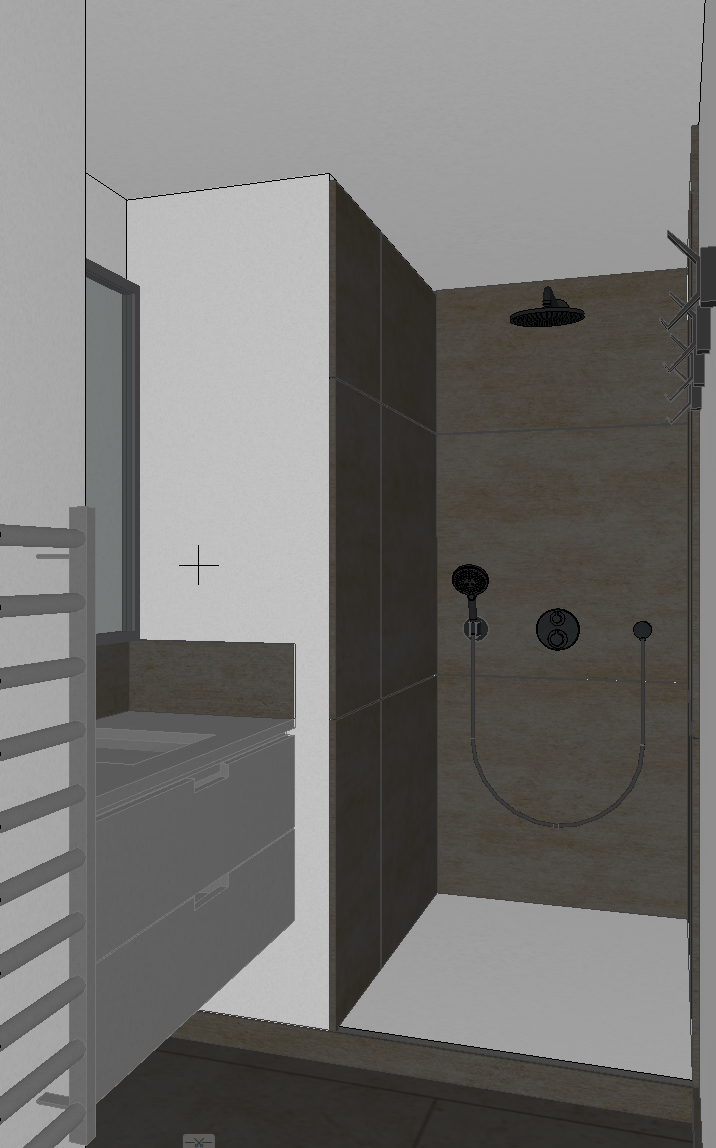 salle de douche mur peinture blanche et douche carrelage beige clair robinetterie encastr e meuble en bois plan en pierre et mroir cadre bois
