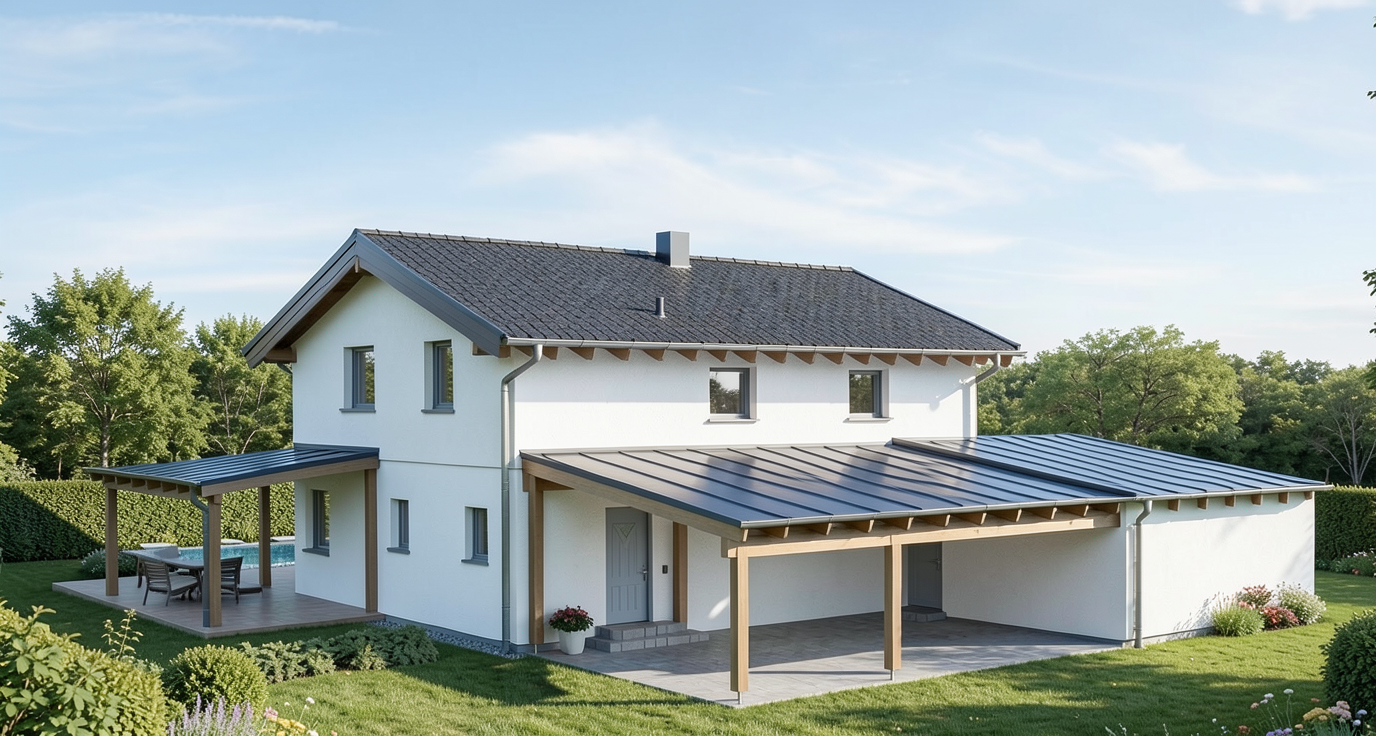 erstelle f r exakt dieses haus eine realistische au enansicht dach anthrazit fassade wei fenster und haust re hellgrau das haus soll in einem dezent modernen garten situiert sein behalte alle ma e und farben des hauses exakt bei