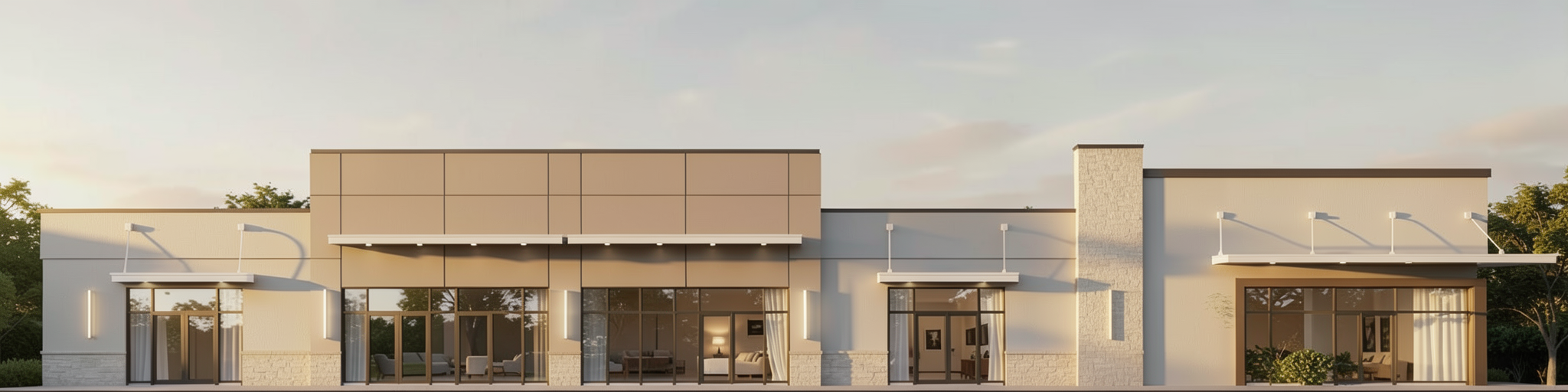 add some cars and people walking around golden hour soft warm lighting on exteriors and interiors fluffy clouds open the view so that the street on the front of the building can be part of this rendering do not modify geometry