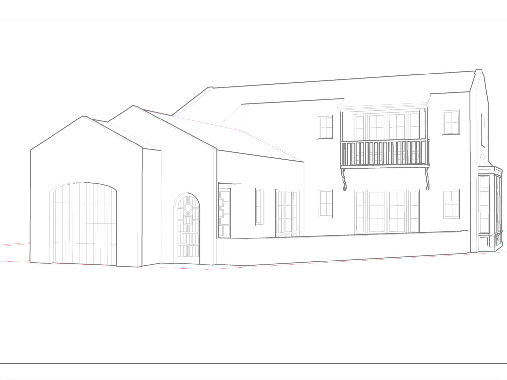 mediterranean revival exterior shot barrel tile roof iron railings and window frames stucco walls wood front door and garage door architecture