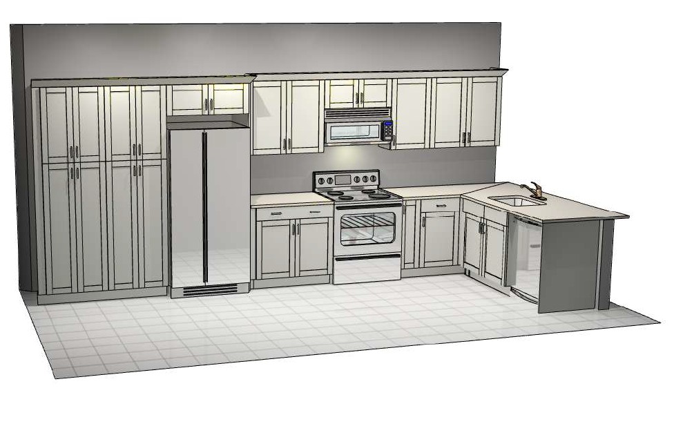 convert this floor plan into a realistic isometric 3d view of a kitchen show the space from an elevated angle with furniture walls and details visible use the same furniture as shows on the plan do not change the orientation of the floorplan