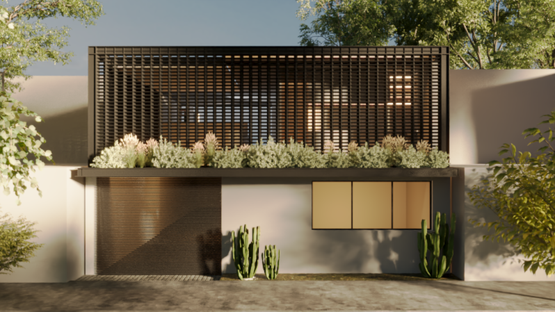 a modern minimalist house with a facade featuring horizontal wooden slats in deep charcoal allowing light to play through below a concrete section painted in soft gray accompanied by warm ochre accents around the windows a dozen lush green succulent plants atop the overhang add natural vibrancy tall cacti guard the base casting elongated shadows on the facade the scene is bathed in golden late afternoon sunlight creating a tranquil and serene atmosphere with surrounding trees contributing a soft rustling sound in the gentle breeze