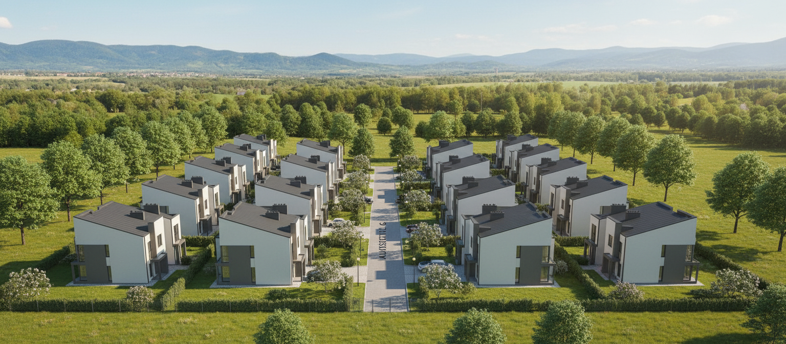 add more trees add people on the street add cityscape background no skyscrapers midday light