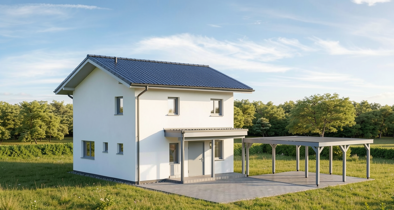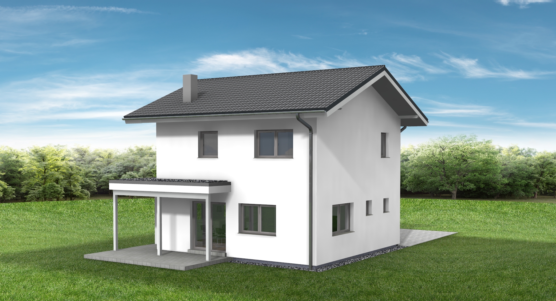 erstelle f r exakt dieses haus eine realistische au enansicht dach anthrazit fassade wei fenster und haust re hellgrau das haus soll in einem dezent modernen garten situiert sein behalte alle ma e und farben des hauses exakt bei