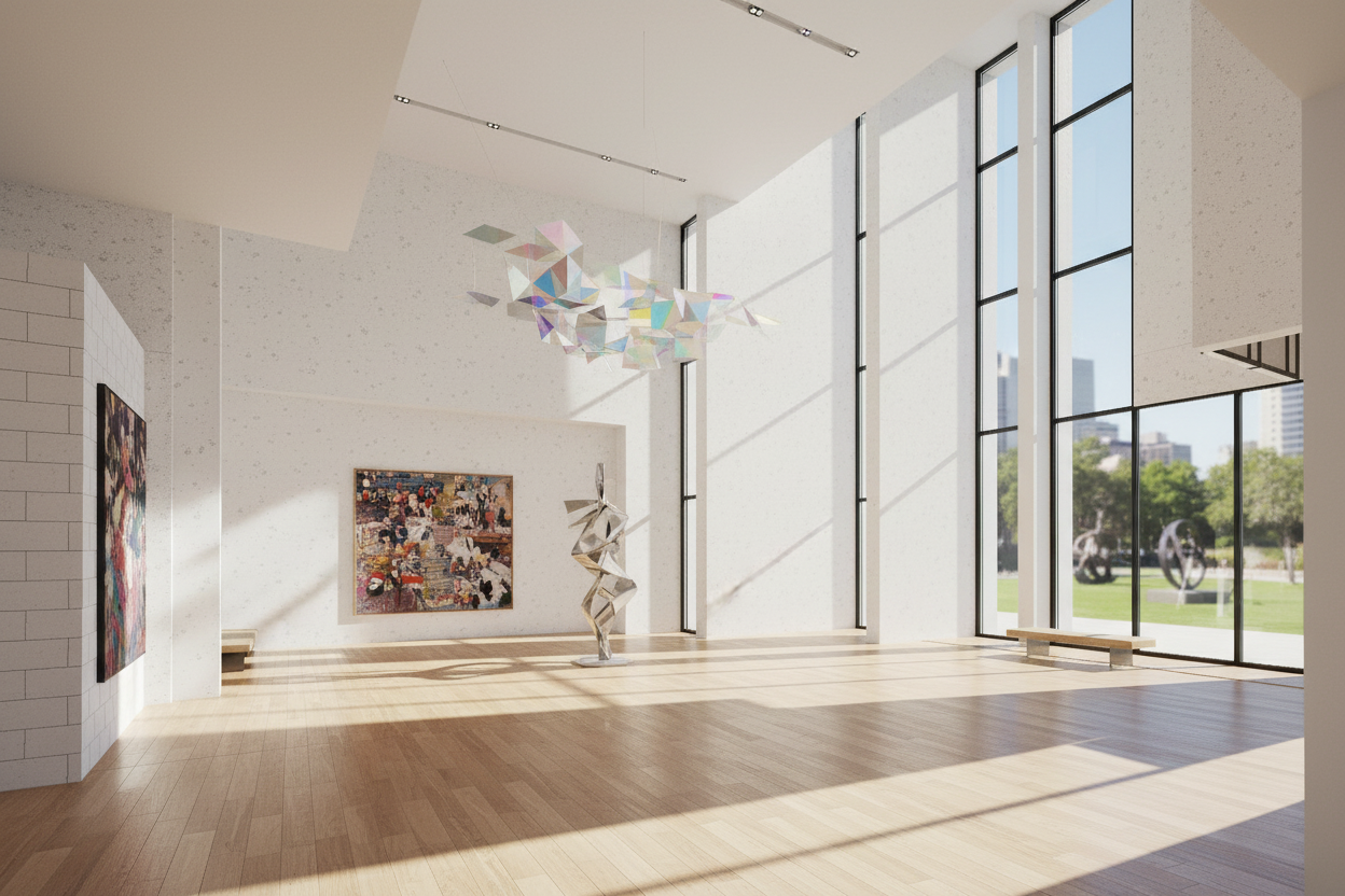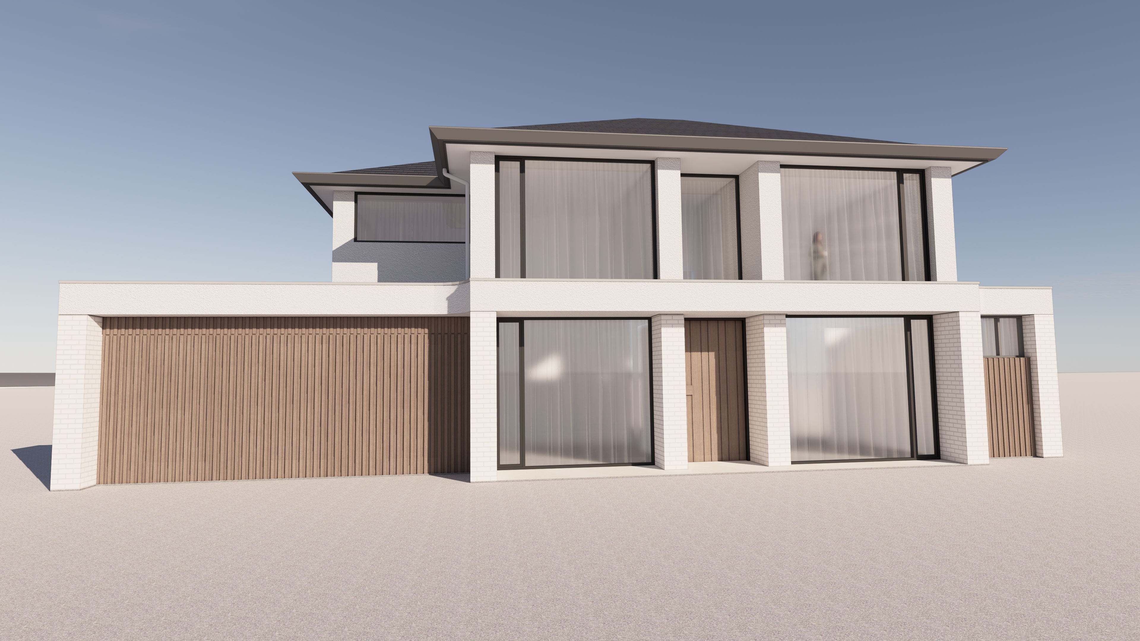 enhance this architectural render to improve photorealism keep the exact building design geometry and all original materials exactly as shown in the source image each surface must remain the same material it already is brick stays brick render stays render cladding stays cladding metal stays metal glass stays glass do not add brick to surfaces that are not brick do not replace or reinterpret any materials only improve natural lighting and global illumination realistic shadows and depth reflections in glass sky realism overall photographic quality no redesign no material changes no new textures enhance realism only while preserving every original material exactly as it appears