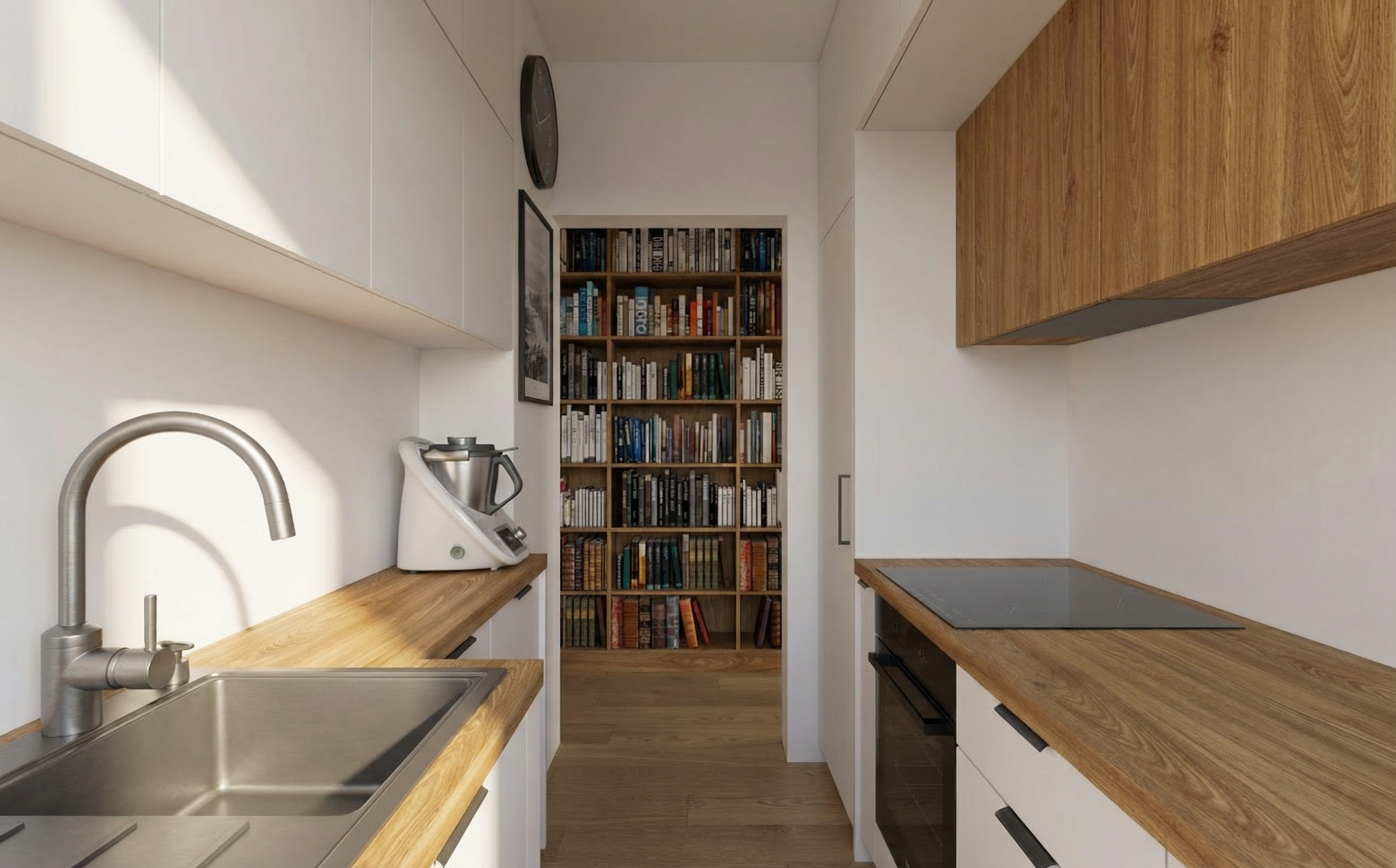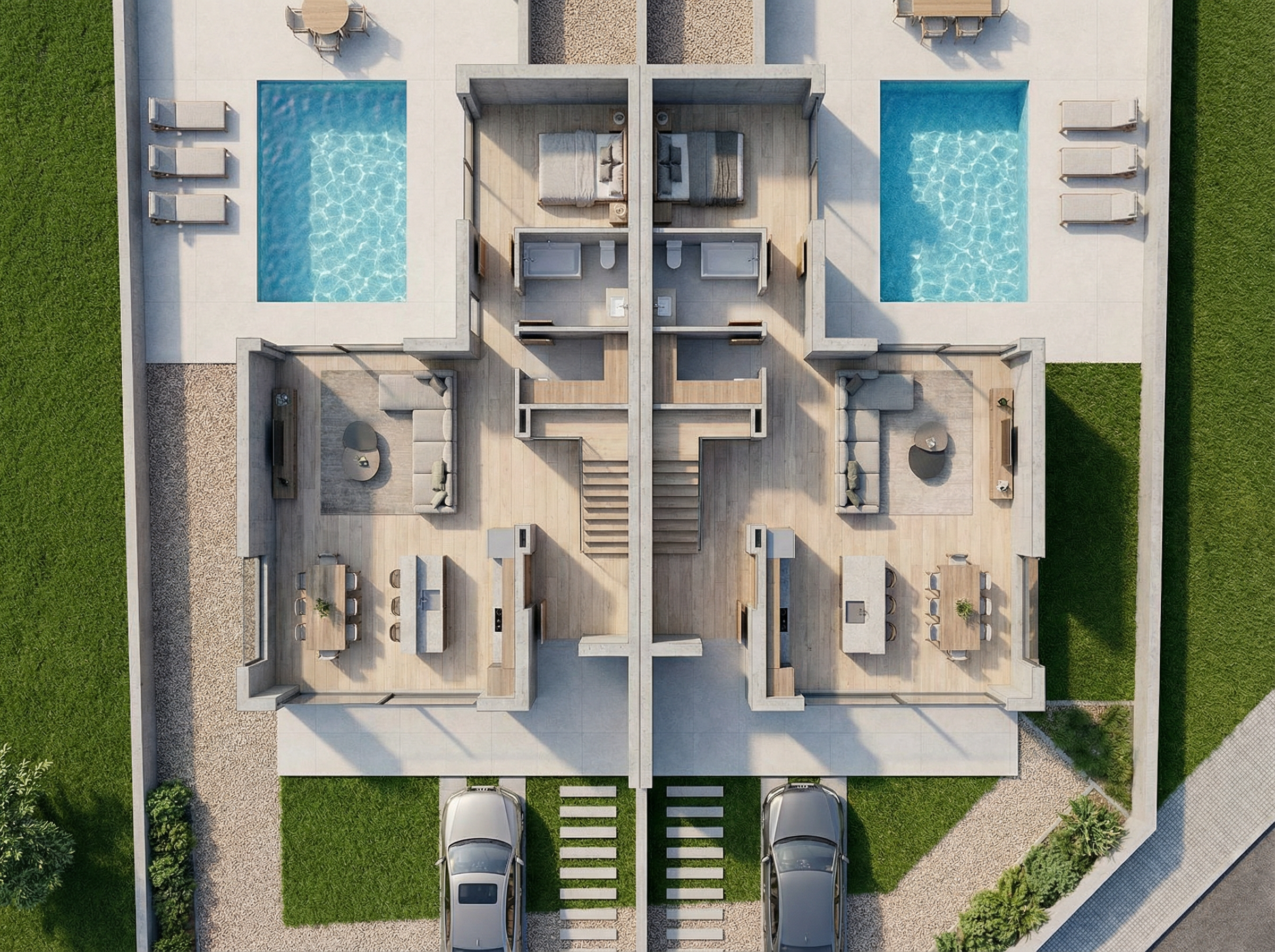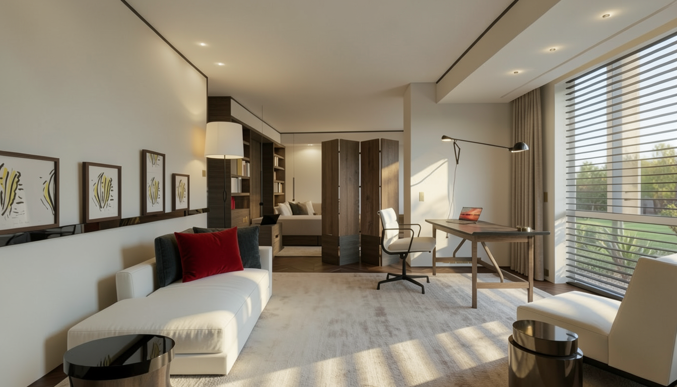 make it photo realistic and better quality keep everything exactly as it is from the design wood is medium brown natural soft daylight daytime in the views in the windows mountain view