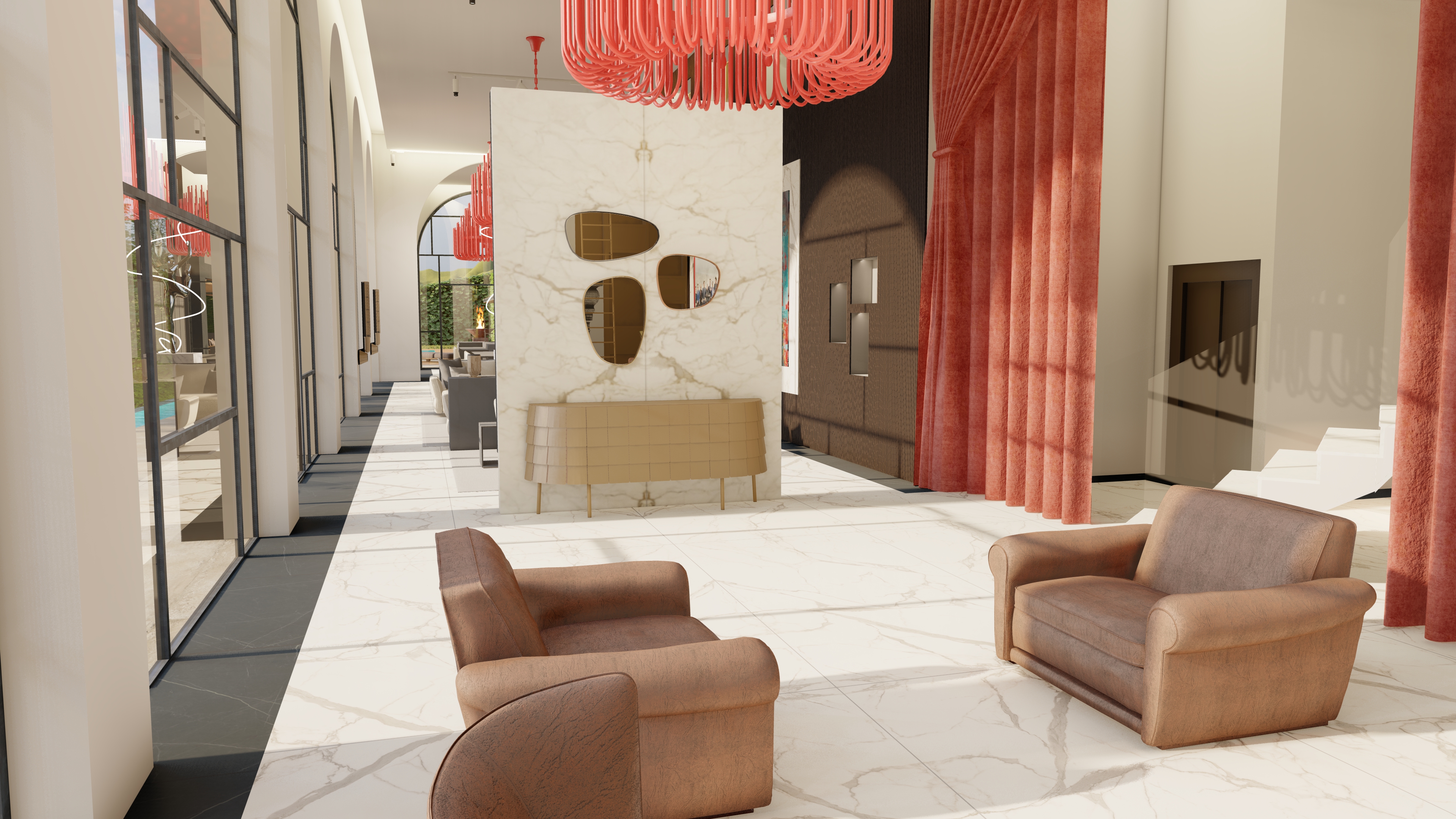 make the view hyperrealistic improve the reflections on the glass and mirrors but do not modify the textures and images of the paintings enhance the lighting to create a golden hour effect the curtain is red velvet 5 meters high improve the velvet effect the armchairs are baxter and made of dark brown leather improve the leather texture reduce the gaps between the floor slabs