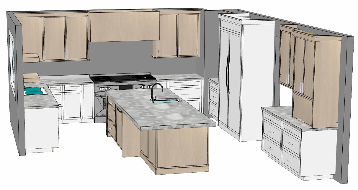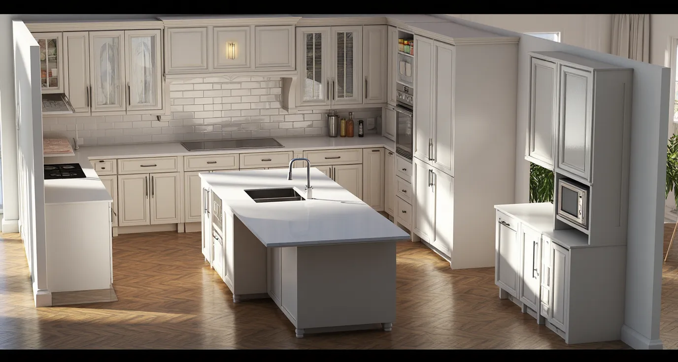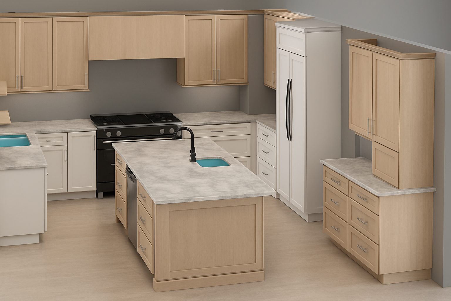make this image more realistic while preserving the exact cabinet layout dimensions door styles hardware appliances and proportions do not change any colors materials shadows or lighting direction only enhance edges smoothness and clarity
