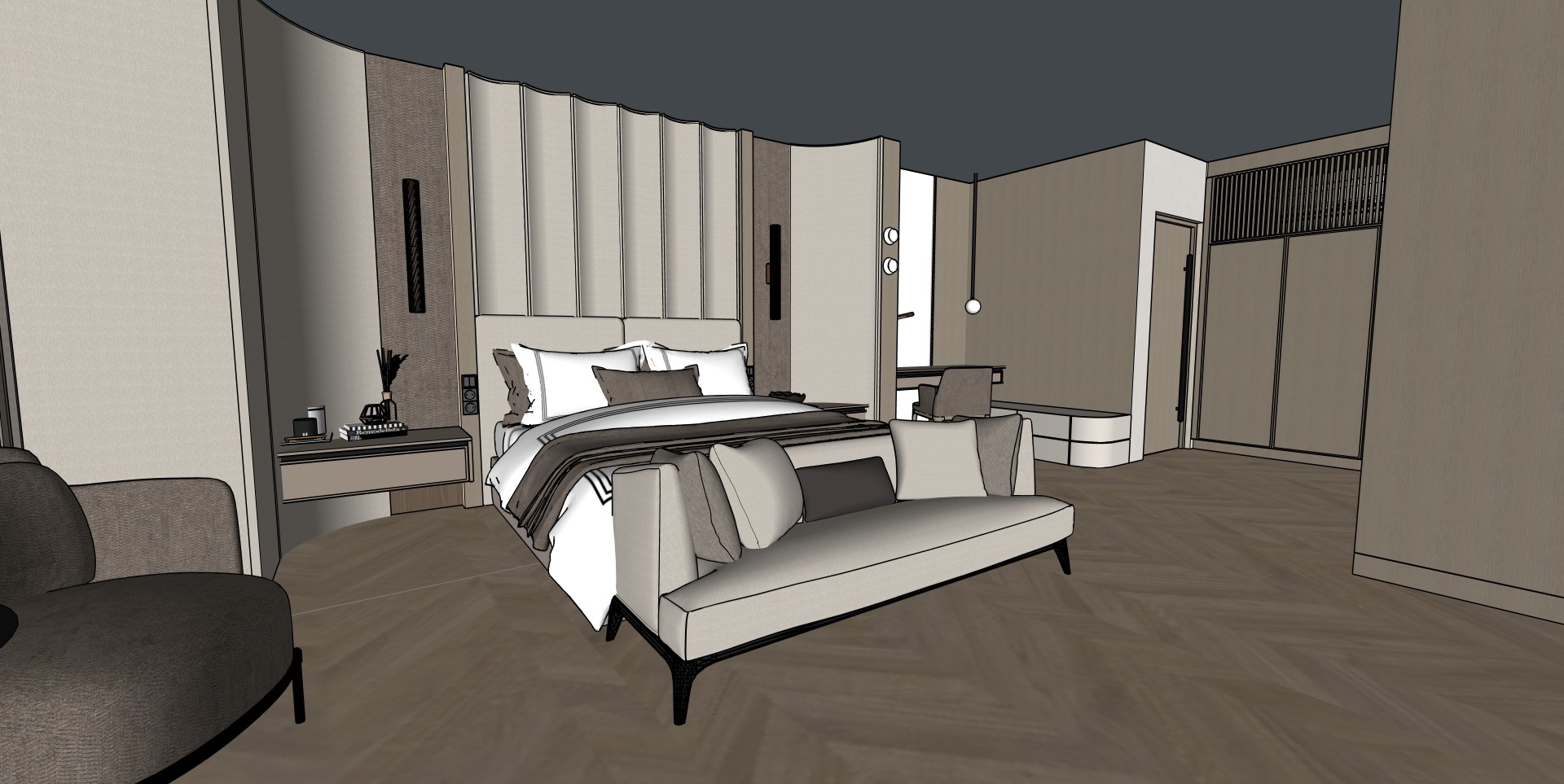 turn on lights textile texture wallpaper cove lighting on side of headboard panels mirror on the panel in front of chair