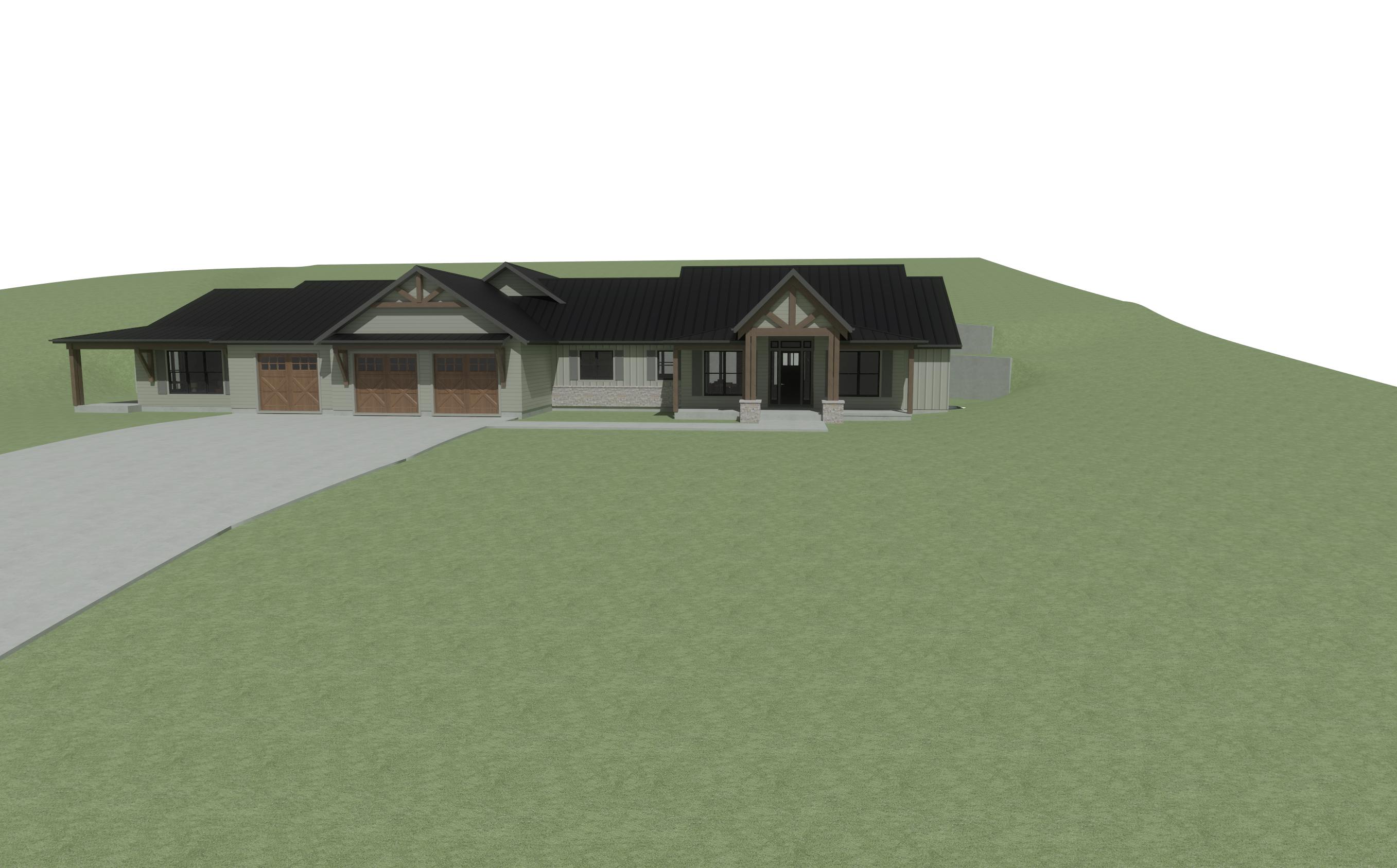 enhance the realism of the existing architectural design while maintaining the same materials and textures focus on realistic lighting shadows and surface details to create a lifelike appearance ensure the siding is preserved in the correct areas making them look authentic and cohesive this is in montana add montana in the woods landscape with nice landscaping near the house add montana vegetation around the house