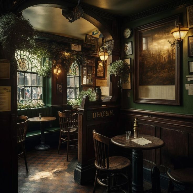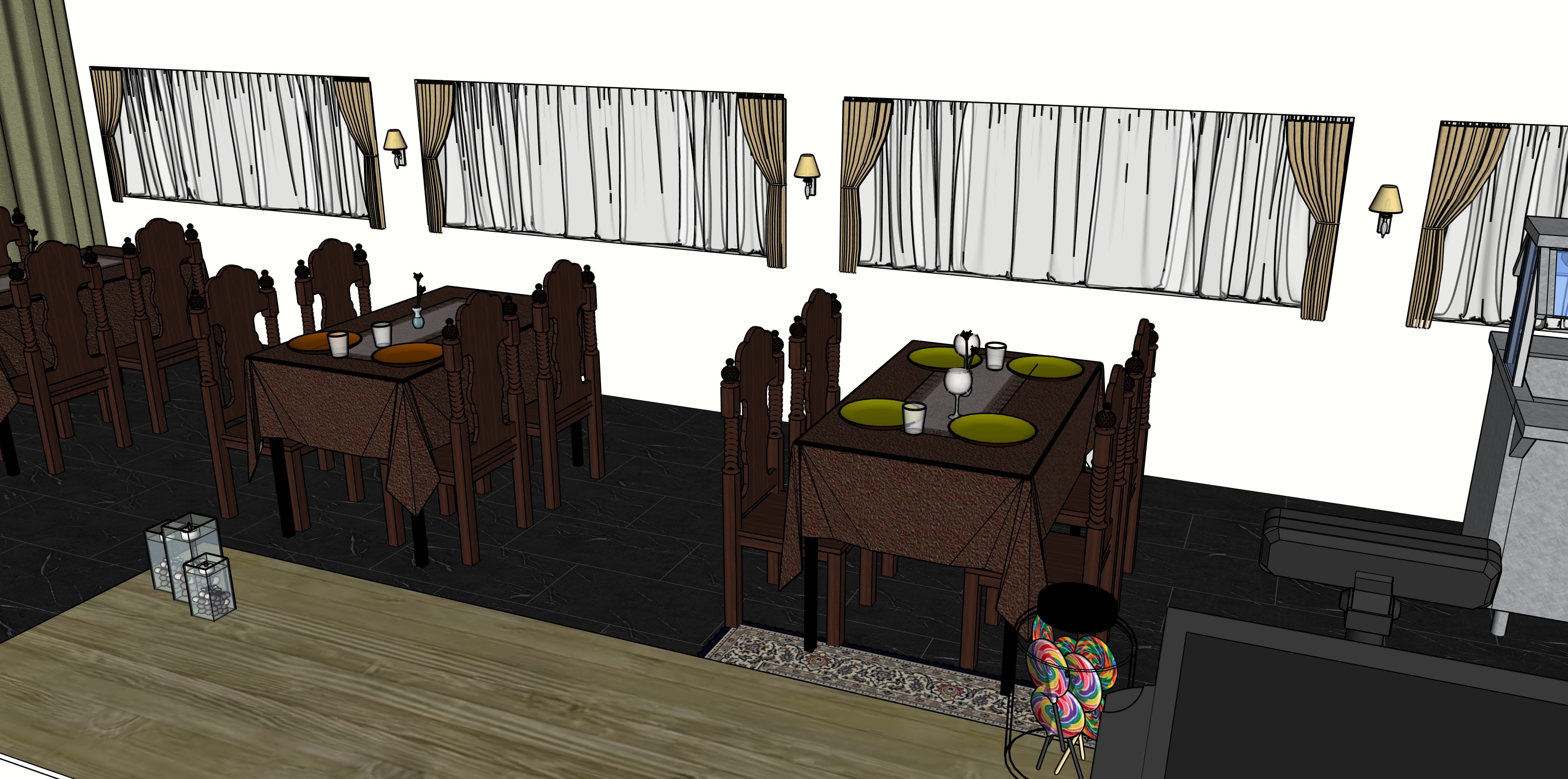 exterior shot soft warm light streams through the small yellow curtained windows casting delicate patterns on the floor and tables