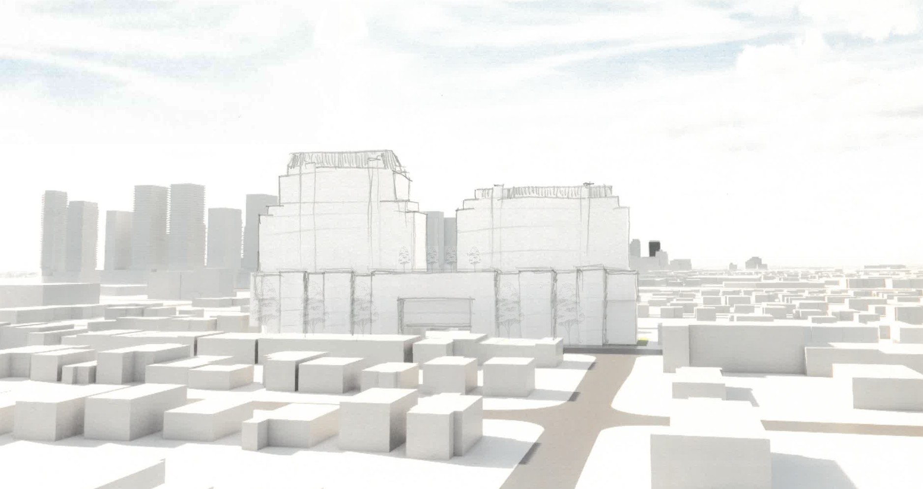 make the building in focus out of limestone on the podium brick and glass materials on the towers