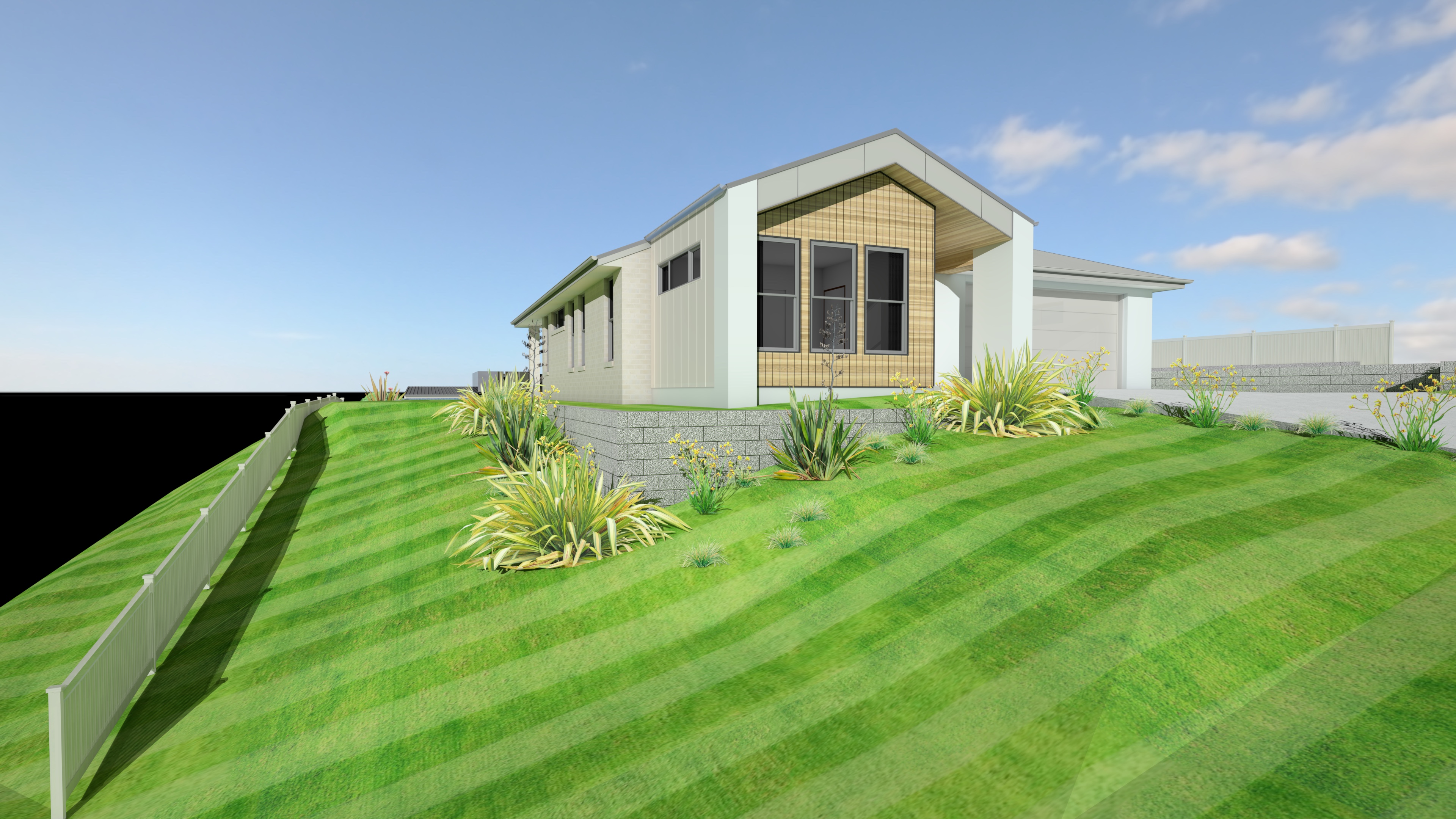render a photorealistic 3d perspective of this house in cairns queensland australia reference the current material style just enhance them keep model geometry the same windows doors roof walls garage door pavement driveway make a lush vegetation that looks native to cairns do not change the view only enhance the current materials and make the landscape nicer vegetation detailed textures in the wood siding fc siding and glass reflections and a vibrant clear sky with light atmospheric depth render in hyper realistic architectural visualization quality 8k resolution