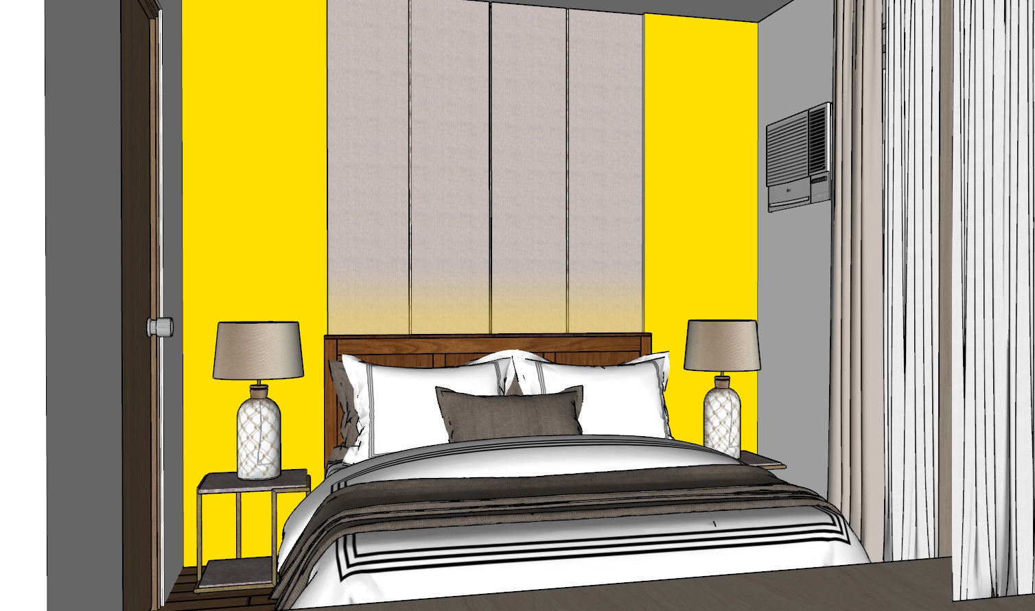 above headboard with lights yellow walls to mirror floor to ceiling