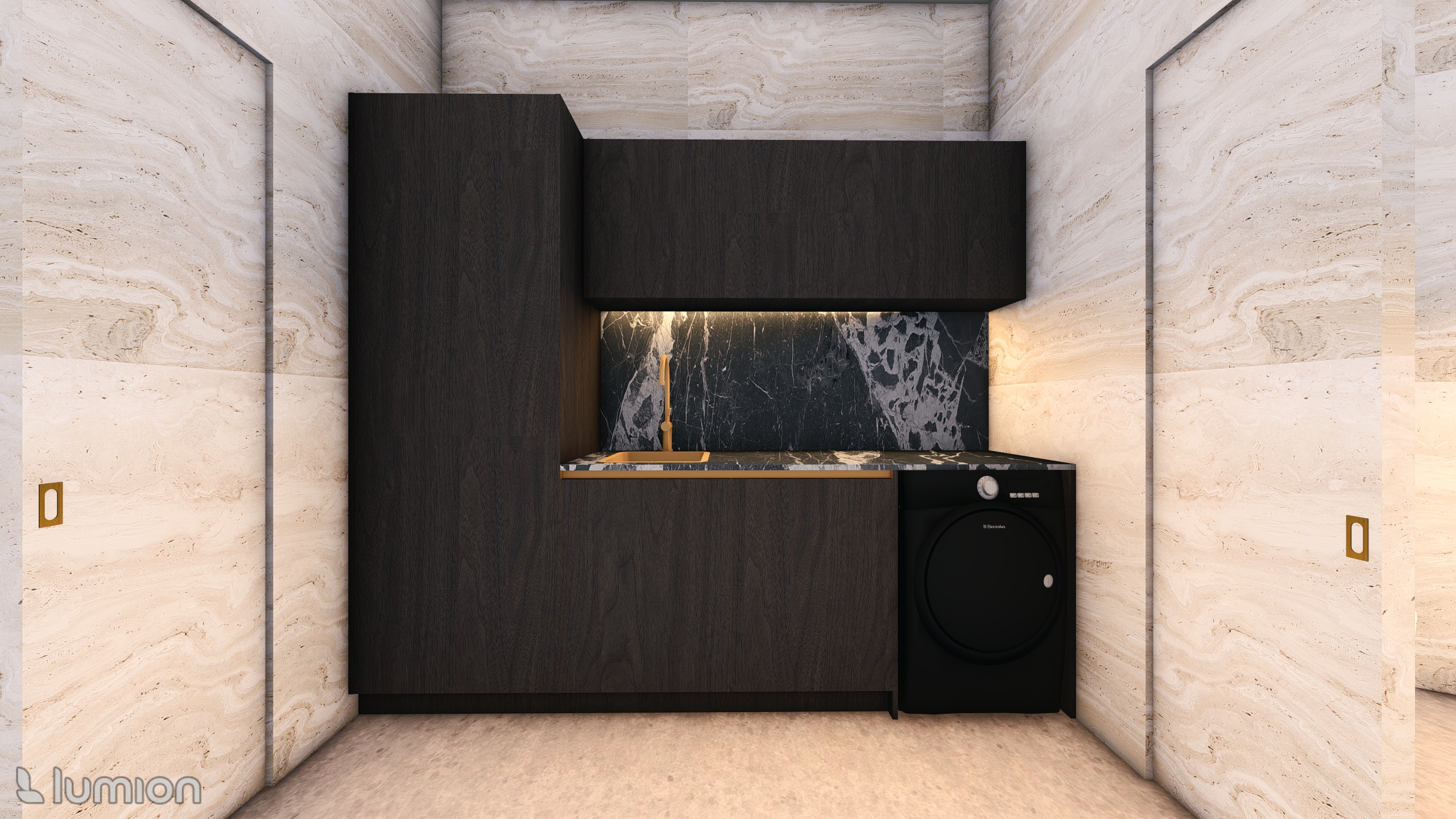 ultra futuristic neo futurism luxury minimalist laundry kitchenette interior the walls are finished in smooth pure white surfaces creating a seamless futuristic backdrop accented by light travertine panels for subtle warmth and texture a compact monolithic cabinetry system in matte dark wood forms clean geometric volumes with upper and lower cabinets blending into a seamless sculptural block the countertop and backsplash are crafted from dramatic black and white veined marble illuminated by warm linear under cabinet lighting that creates a refined cinematic glow a minimalist gold faucet adds a futuristic luxury accent on the right side a sleek matte black front loading washer integrates into the cabinetry maintaining the streamlined design soft ambient lighting from minimal ceiling fixtures enhances the clean architectural lines the flooring is raw matte concrete grounding the space with an industrial luxe tone the overall atmosphere is hyper modern elegant and functional with seamless surfaces precise geometry and high end materials rendered in 8k lumion style photorealism with a futuristic luxury aesthetic