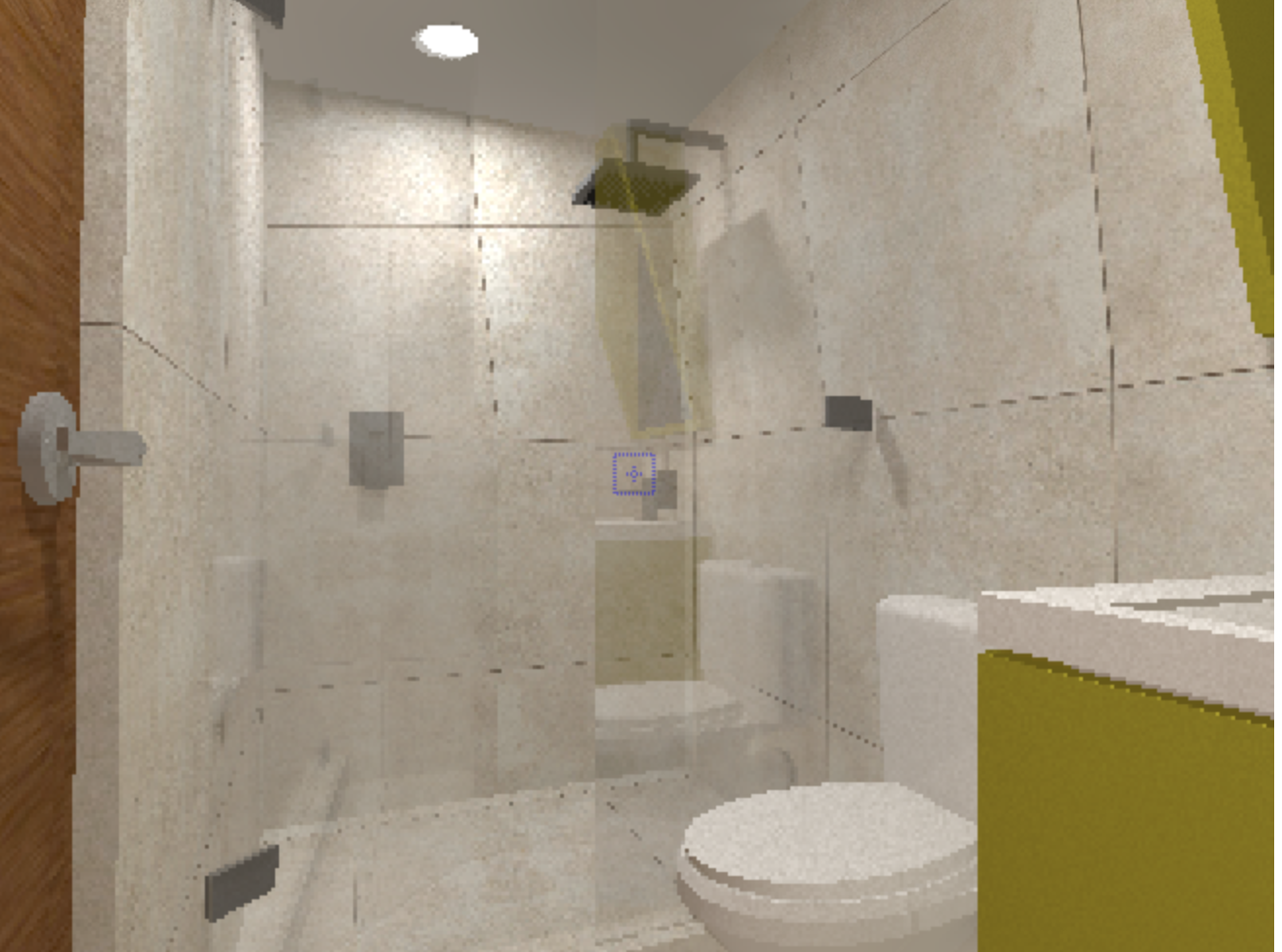 create a photorealistic image of a bathroom the vanity cabinet is made of american walnut wood venner showcasing natural wood grain elegant texture and a high end appearance with a white countertop the surfaces must appear fully seamless continuous clean and subtly reflective with no visible joints emphasizing a smooth monolithic look the walls and floor are finished in light gray porcelain tile and the ceiling is white the mirror features a perimeter frame in american walnut venner with indirect backlighting the shower doors are made of tempered glass with stainless steel hardware add bathroom accessories and decoration for a realistic and elegant ambiance