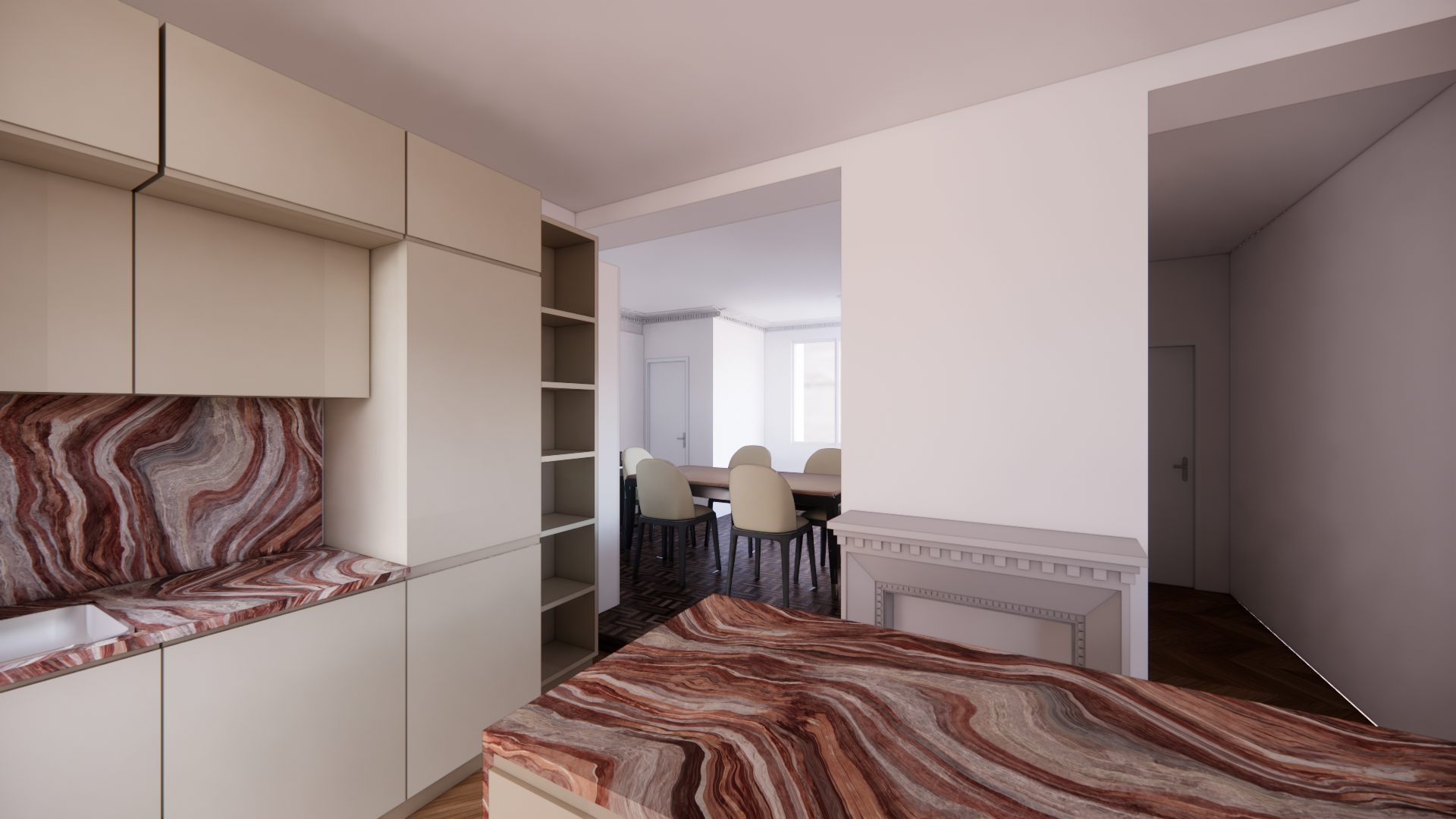 add a large art deco mirror above the fireplace mantel featuring an elegant geometric frame incorporate art deco ceiling moldings with refined symmetrical lines place a few cookbooks on the shelves on the left arranged naturally add some tableware elements plates bowls glasses on the countertops to create a realistic and warm atmosphere