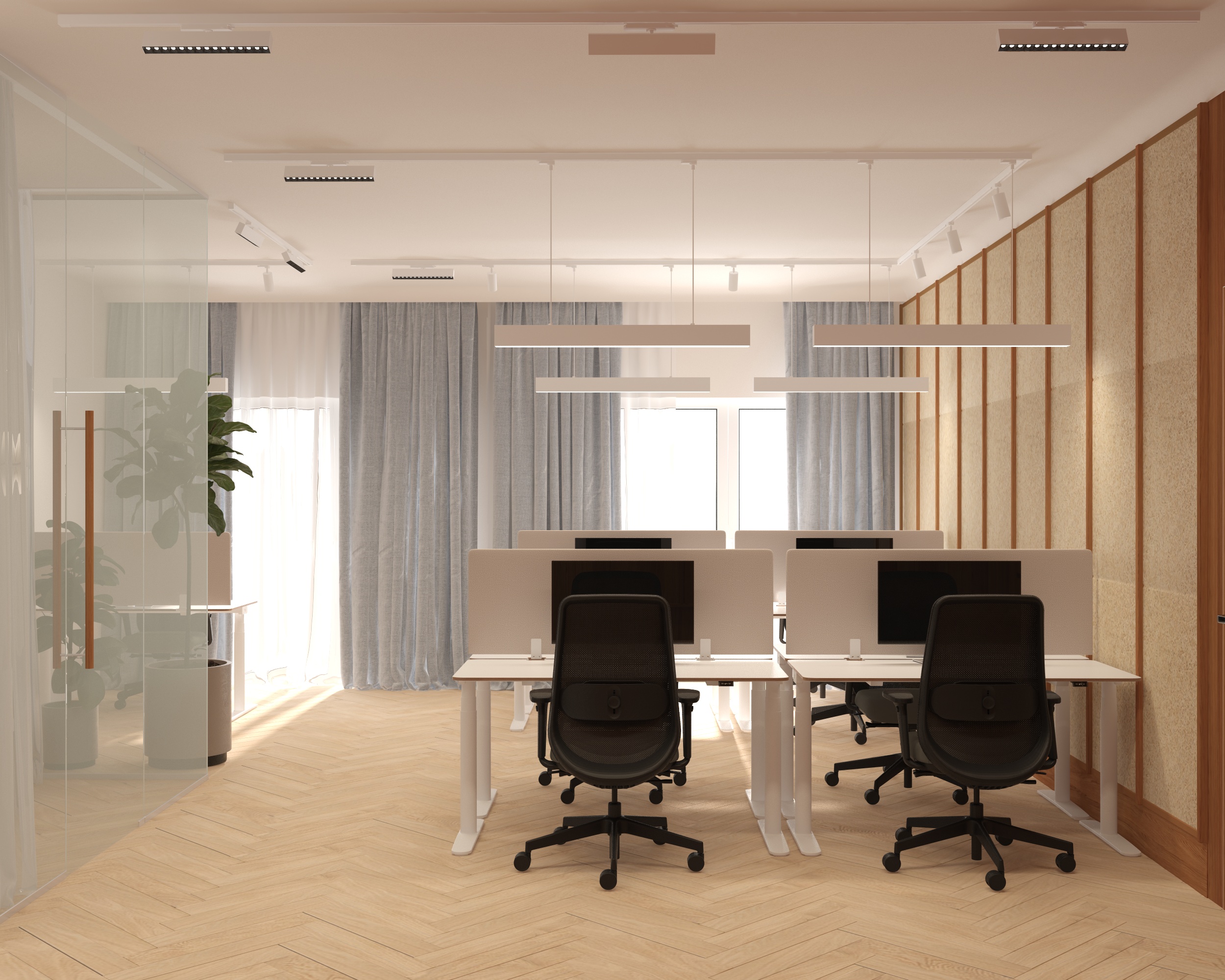 transform this 3d view into a high end photorealistic architectural render add a little natural sunlight entering from the windows creating soft shadows and realistic light bounce but keep the whole image light and not too warm office vibe with a little domestic atmosphere outside show a modern terrace with landscaped garden make the view naturally blurred improve all material textures to look realistic and high resolution the wall on the right side those are wood wool acoustic panels light natural wood tone fibrous texture slightly rough and porous surface on the left side there is a glass cubical behind it there are two pot plants standing on the floor behind them there is an additional desk enhance material detail realistic reflections global illumination and natural color balance keep the original geometry and camera angle unchanged