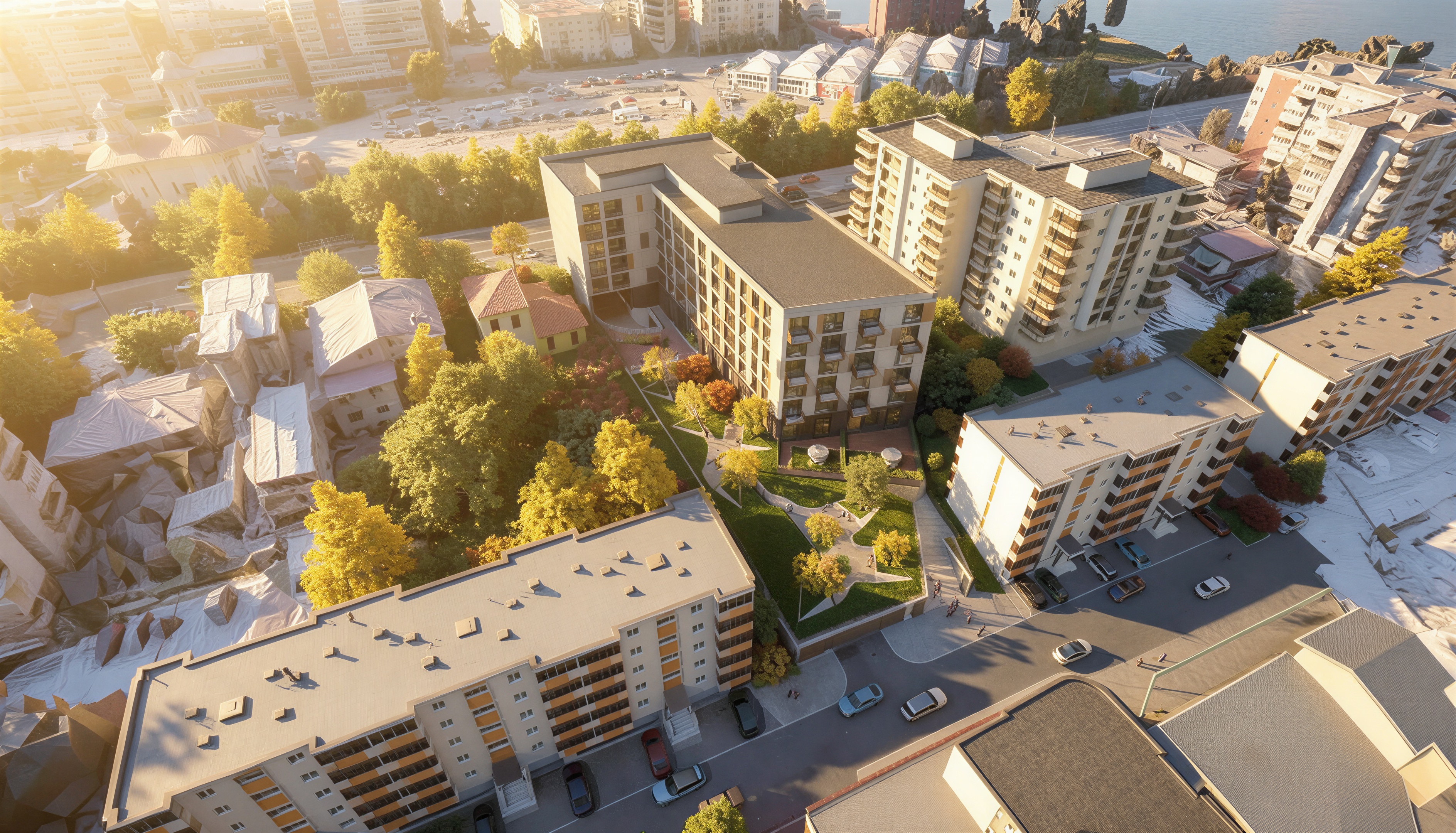 important preserve the existing geometry and the existing context exactly as provided do not modify alter reinterpret add remove scale or reshape any geometry do not change the site surroundings street layout neighboring buildings vegetation or context elements do not modify geometry scale proportions buildings road layout sidewalks or surrounding context in any way photorealistic architectural rendering clean and balanced contrast calm cinematic mood style contemporary european residential architecture minimalist premium understated delet all cars and people existing add people in motion subtle motion blur and some cars in motion