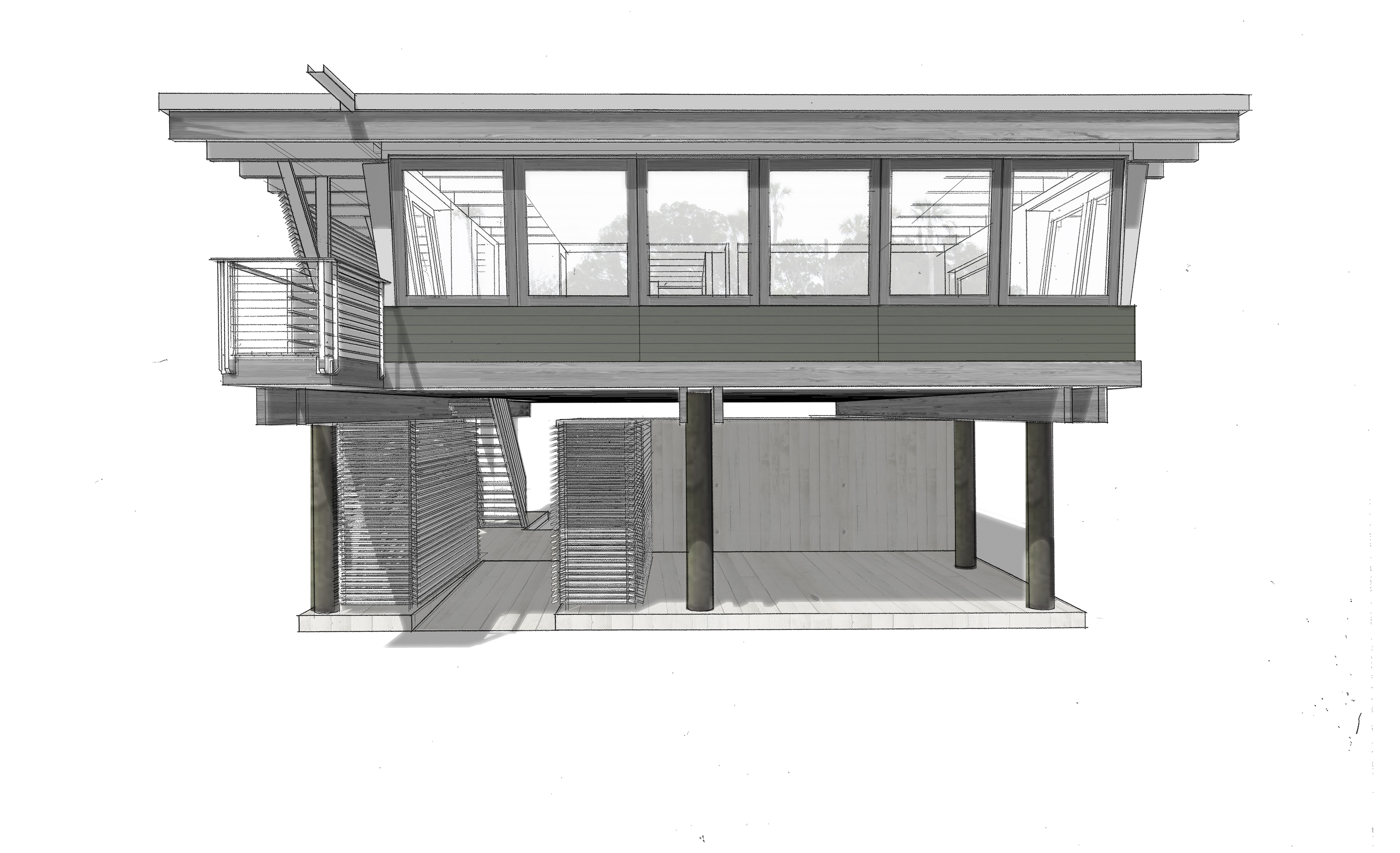rendering in lush florida landscape with small yard concrete seawall and spring fed river in foreground house should be rustic sunny day