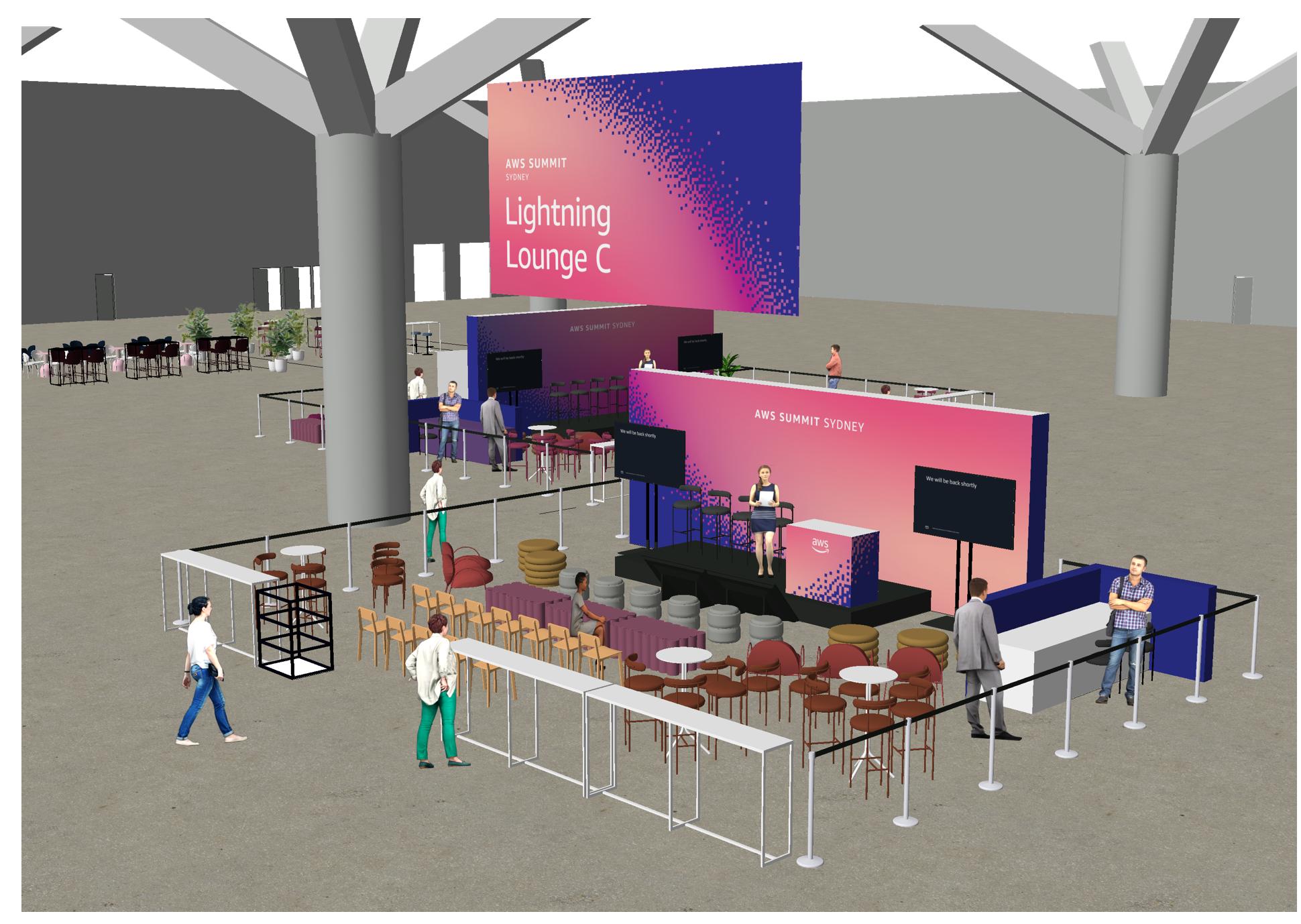 render this 3d model with realistic textures the context is an dark industrial expo location similar vibrant expo stands in the background with polished concrete floor ceiling with barely visible trusses with several bright pink lights blurred business people with lanyard sitting in the space to watch