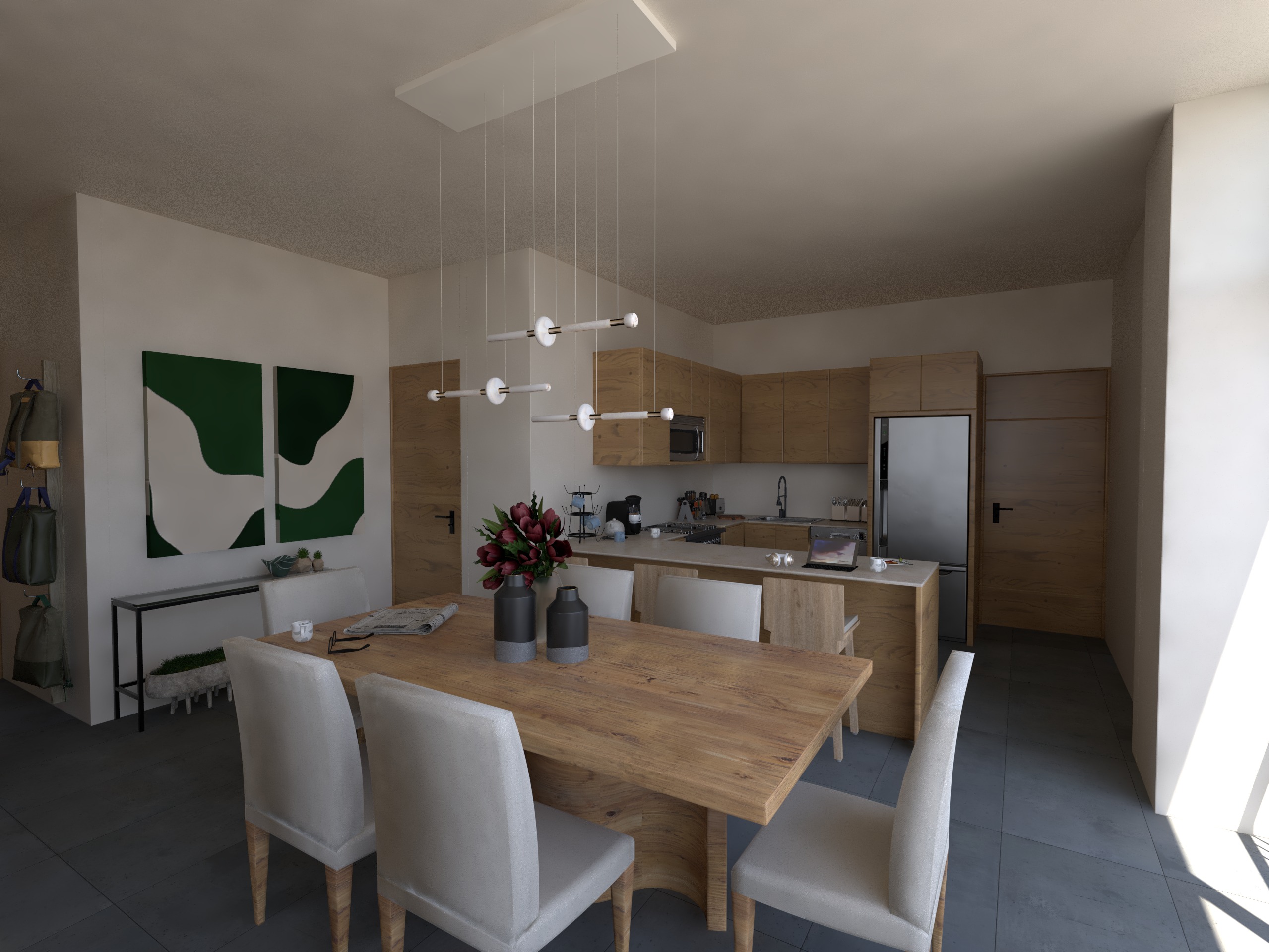 create a photorealistic enhancement of this contemporary luxury open concept kitchen dining interior render maintain all existing furniture decorative elements wooden textures natural wood dining table white upholstered dining chairs wooden kitchen cabinetry stainless steel appliances modern geometric wall artwork green and white abstract canvas ceramic vases with red flowers modern pendant lighting fixture wooden entry doors console table with accessories coat stand dark flooring white walls and all architectural elements with their current colors and forms implement advanced vray photorealistic lighting deploy sophisticated global illumination with refined ambient illumination throughout the open concept space integrate premium hdri environmental lighting for refined residential ambiance add realistic warm accent lighting from the modern geometric pendant lighting fixture creating sophisticated work and dining area illumination implement subtle caustics and light reflections from metallic surfaces and glass finishes significantly enhance all material quality add realistic wood grain depth and micro textures to natural wood dining table and kitchen cabinetry with authentic wood color variations and natural aging patina enhance white upholstered dining chairs with detailed fabric weave micro textures showing realistic light absorption and soft dimensional folds render stainless steel kitchen appliances with precise metal finish showing realistic reflectivity specular highlights and light absorption characteristics add sophisticated finish to modern geometric wall artwork with proper canvas texture and paint finish variations enhance ceramic vases with glossy porcelain finish showing light refraction and realistic gloss properties render the red flowers with natural petal texture and realistic color saturation improve lighting dynamics create warm directional lighting from the modern pendant fixture casting sophisticated shadows across the dining and kitchen areas add soft fill light bouncing from white walls creating refined ambient illumination implement proper light interaction with textile surfaces chair upholstery showing realistic fabric behavior under warm task lighting enhance stainless steel surfaces with realistic reflections showing the interior environment add subtle reflections on dark flooring from pendant and ambient lighting render the console table accessories with appropriate material finish variations apply premium color grading with warm sophisticated contemporary luxury kitchen dining ambiance refined and inviting implement realistic ambient occlusion for shadow depth in all architectural corners and cabinetry details include subtle cinematic depth of field with primary focus on the dining table area ensure overall aesthetic conveys luxury contemporary kitchen dining design with museum quality architectural elegance final render must achieve premium architectural interior photography quality with 8k resolution clarity and refined contemporary styling