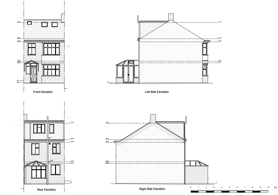 use these elevations to create a 3d visual of the rear elevation slightly at an isometric angle windows and doors should be white upvc brickwork should be a yellow london stock brick fascias and soffits should be white gutters and downpipes should be black and hung tiles on the dormer should be a reddish brown