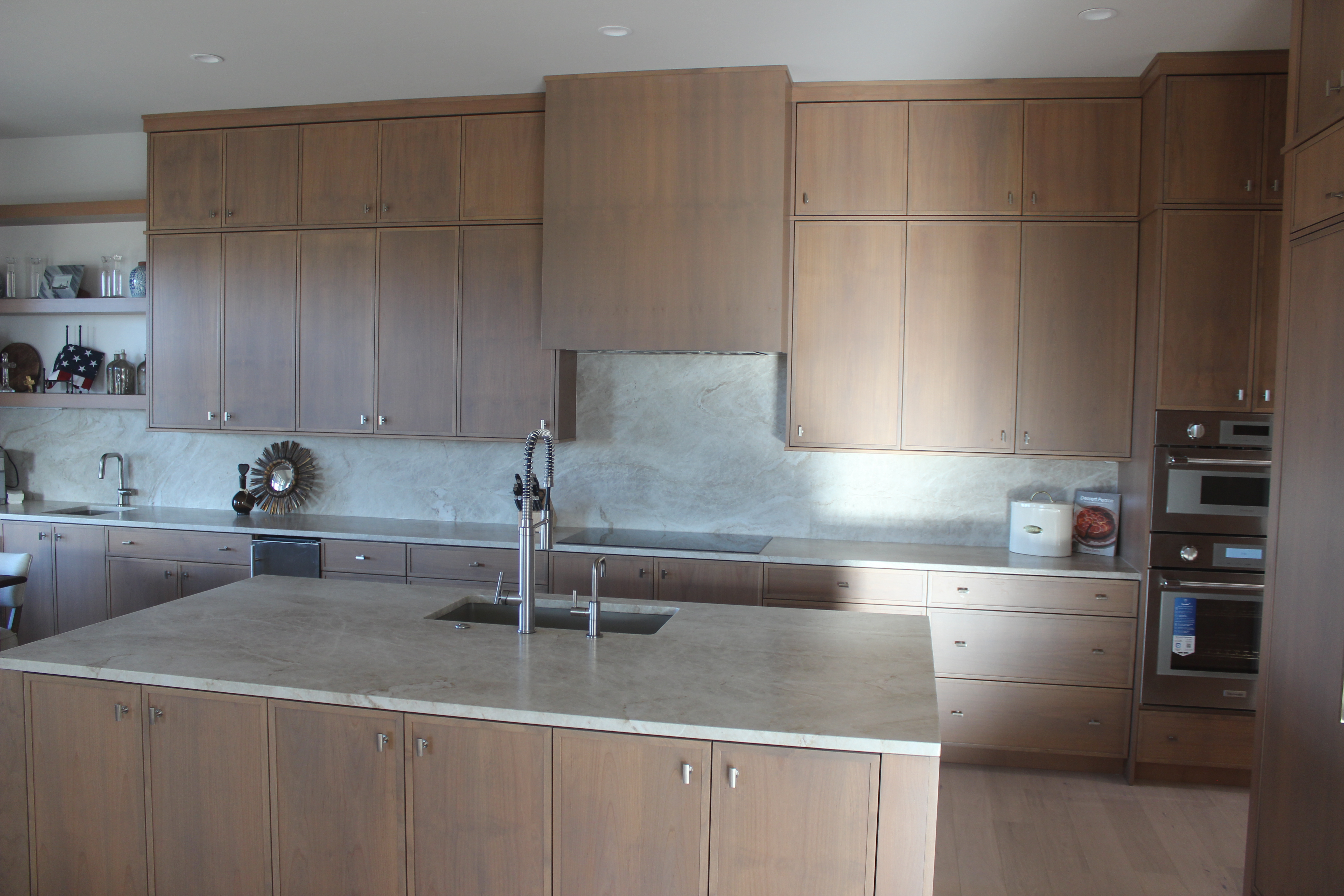 make the lighting more natural for an airy kitchen turn the can lights on stage the countertops and floating shelves on the left for a modern simplistic kitchen