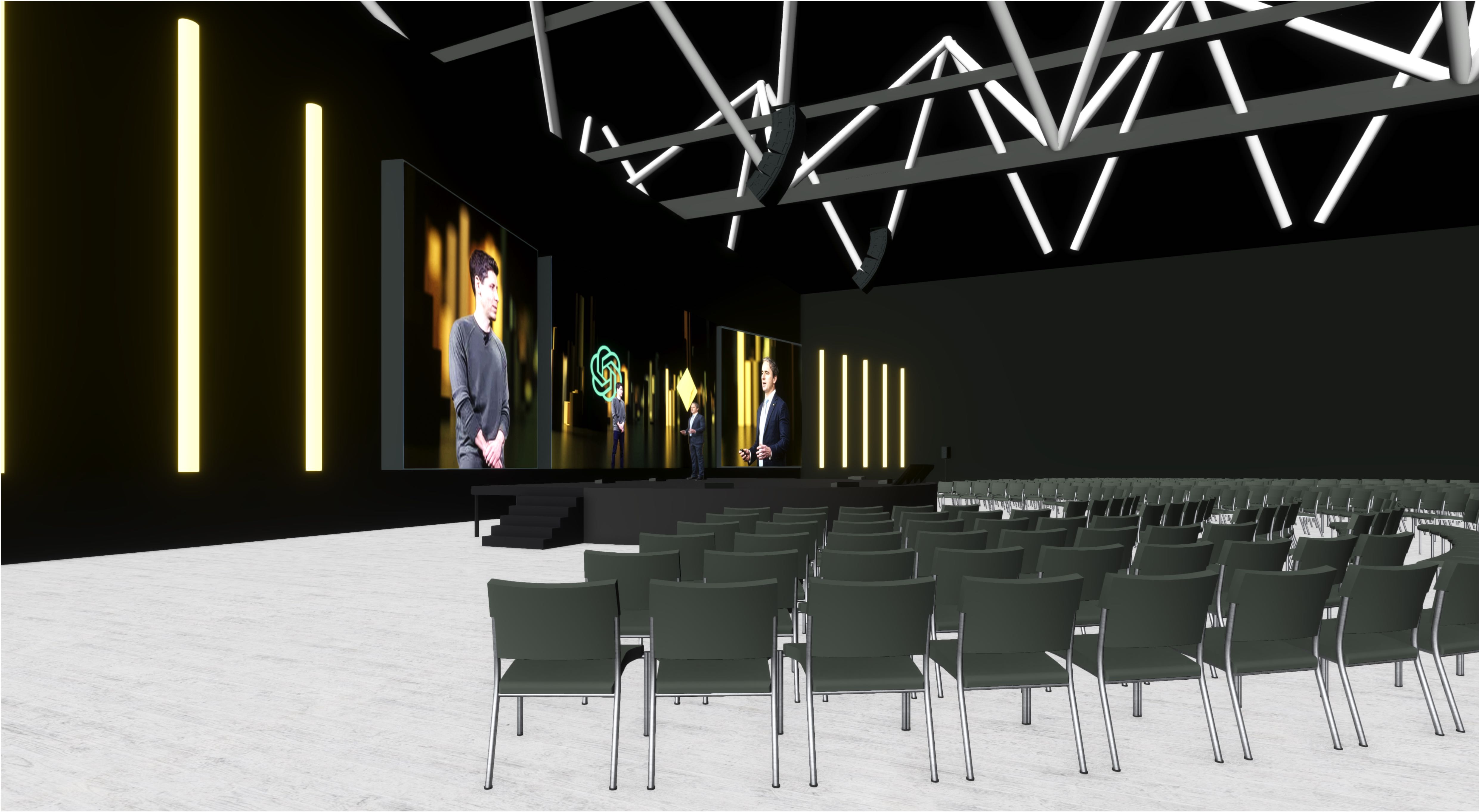 a dark immersive stage environment with an oversized suspended led screens add business people in smart casual work clothing in the audience
