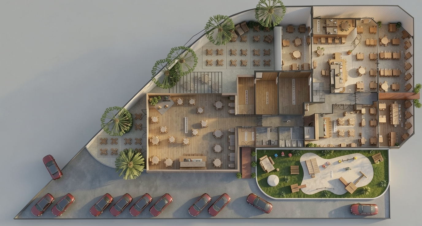 create a high end photorealistic wedding dinner rendering based on the provided sketchup style image keep the room architecture camera perspective columns beams windows staircase and table layout exactly as shown transform the scene into a luxury wedding dinner setting with large scale fabric installations draping structure the tall columns and the horizontal beams connecting them represent a professional event truss pipe and drape support system all wall fabrics are mounted to the horizontal beams and hang down from this structure full wall wedding drapery installation install continuous elegant light beige wedding draping along the entire perimeter of the room left wall back short wall right wall front wall the draping should behave like a large continuous fabric wall installation suspended from the beam structure with soft elegant vertical folds windows integration the draping must run continuously across the wall including above the windows the fabric should not stop at the windows at each window the fabric is softly gathered and fanned to the sides creating elegant curtain openings that frame the windows while keeping them visible above the windows the fabric continues smoothly as part of the draped wall table styling all banquet tables feature dark forest green floor length continuous table draping with soft fabric folds each place setting includes silver charger plate silver cutlery wine glasses and water glasses decor concept refined wedding dinner atmosphere elegant and minimal styling no florals and no centerpieces rendering style ultra photorealistic luxury wedding event realistic fabric textures soft natural lighting cinematic shadows detailed cloth folds high end event design professional event photography look 8k photorealistic render