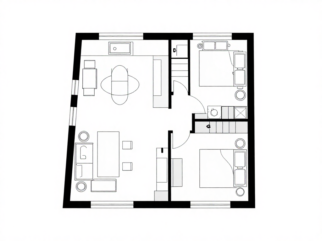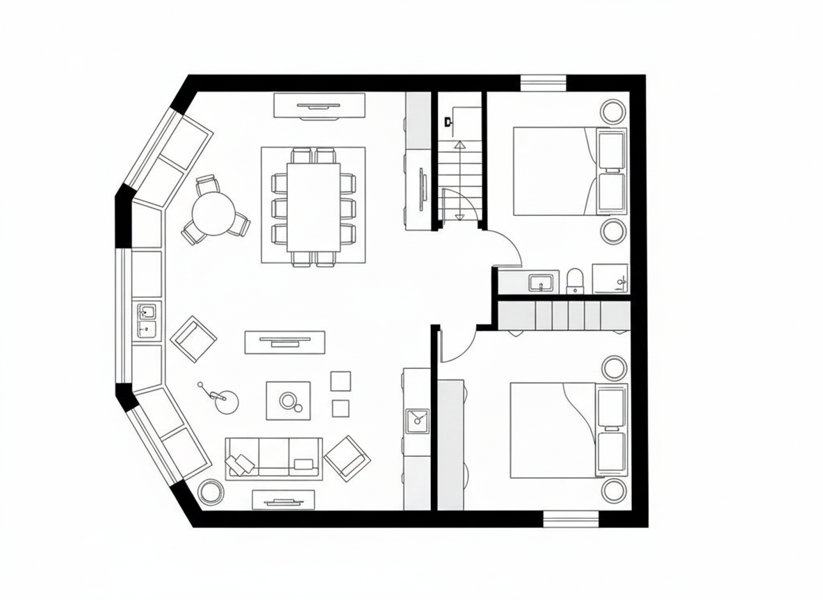expand the floor plan a bit include a bay small bay window off in the corner and add extra furniture an entrance door and a staircase