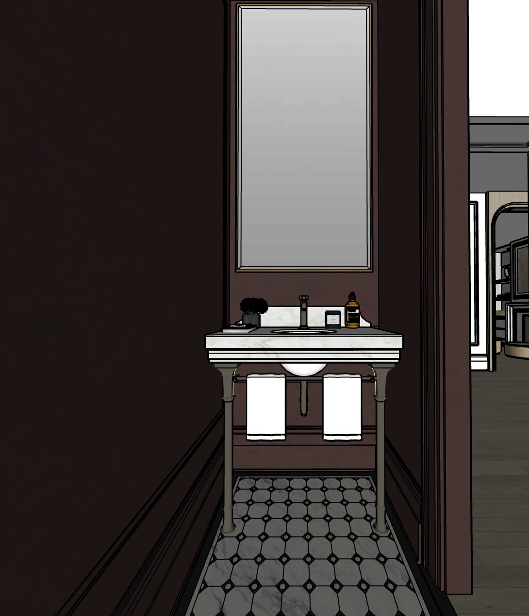 a modern interior hallway featuring an elegant dark blue door with intricate glass patterns set against a backdrop of light gray walls the floor is a rich dark wood conveying warmth and sophistication on the left a minimalist shelving unit with stacked decor pieces in shades of charcoal and cream on the right a sleek white wardrobe with subtle metallic handles sheer white curtains softly diffuse natural light enhancing the cozy serene atmosphere the reflection in the mirror is a black wall mounted toilet with brush wall sconce on the wall