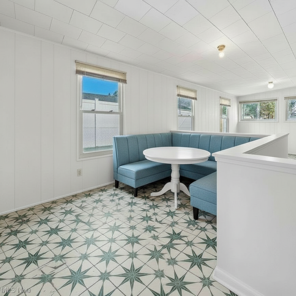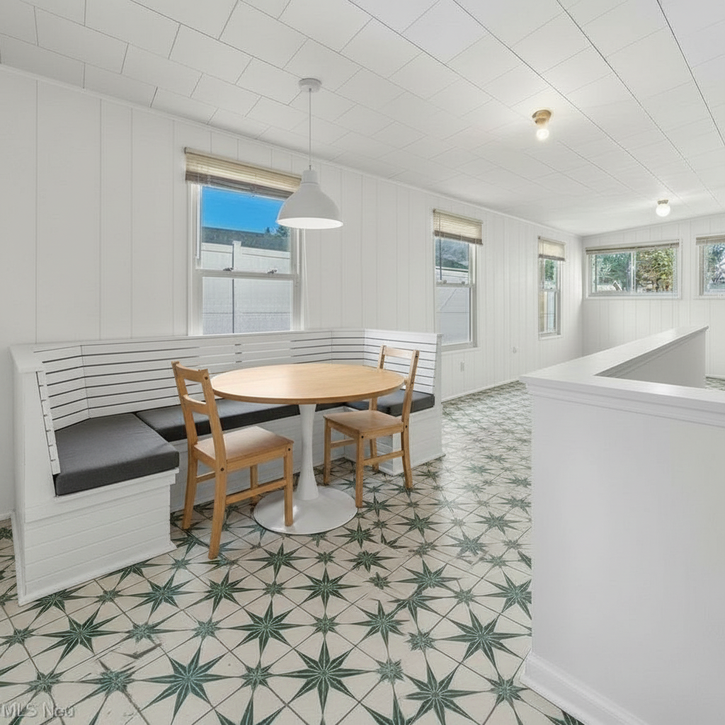 make this room look like an inviting sunroom with a small dining table in the back corner and lounge chairs