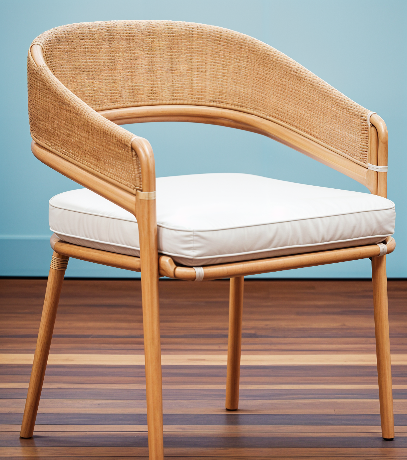 modernist rattan weaving inspired chair wooden wire brush finish legs upholstered seat and back architecture