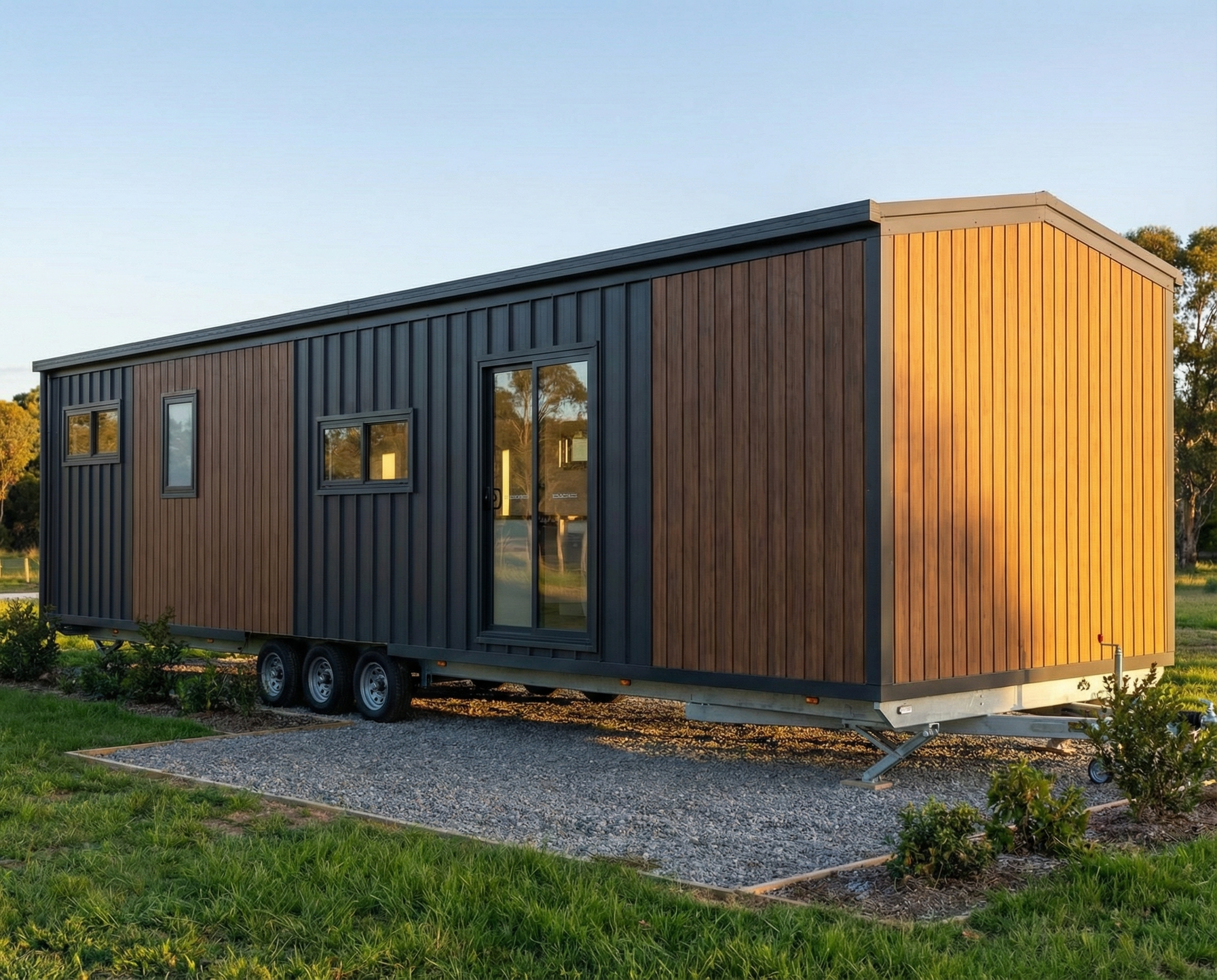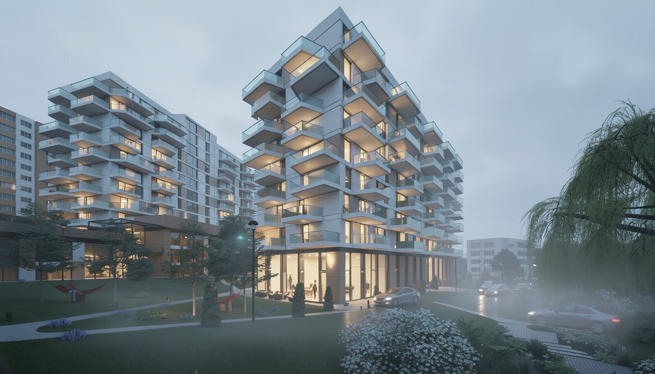 modern single story industrial warehouse building maintain the exact massing proportions roof slope door and opening positions exactly as shown in the reference image do not redesign the building geometry primary facade finished in smooth matte near black ral 7021 anthracite grey metal cladding with subtle panel joints and realistic roughness variation emphasize the large diagonal recessed wall on the right side finished in raw cast in place concrete with visible but subtle formwork texture sharp clean edges and realistic depth shadow highlight the deep roof overhang wrapping the corner of the building creating strong architectural shadow lines and a heavy industrial expression the overhang must remain thick crisp and clearly visible large industrial garage doors and personnel doors in dark neutral tones with realistic metal material and clean detailing site finished with clean dark asphalt surface extending beyond the building include a continuous 1 meter wide light concrete pedestrian walkway around the building perimeter with precise edges and construction joints lighting soft nordic overcast daylight for realistic industrial mood soft global illumination natural shadow falloff no dramatic sunset camera eye level three quarter view from the corner showing both the long facade and the diagonal concrete recess slight wide architectural lens professional composition ultra realistic materials sharp textures physically based rendering high detail in metal cladding concrete pores asphalt grain and glass reflections hyper realistic architectural visualization quality 8k resolution