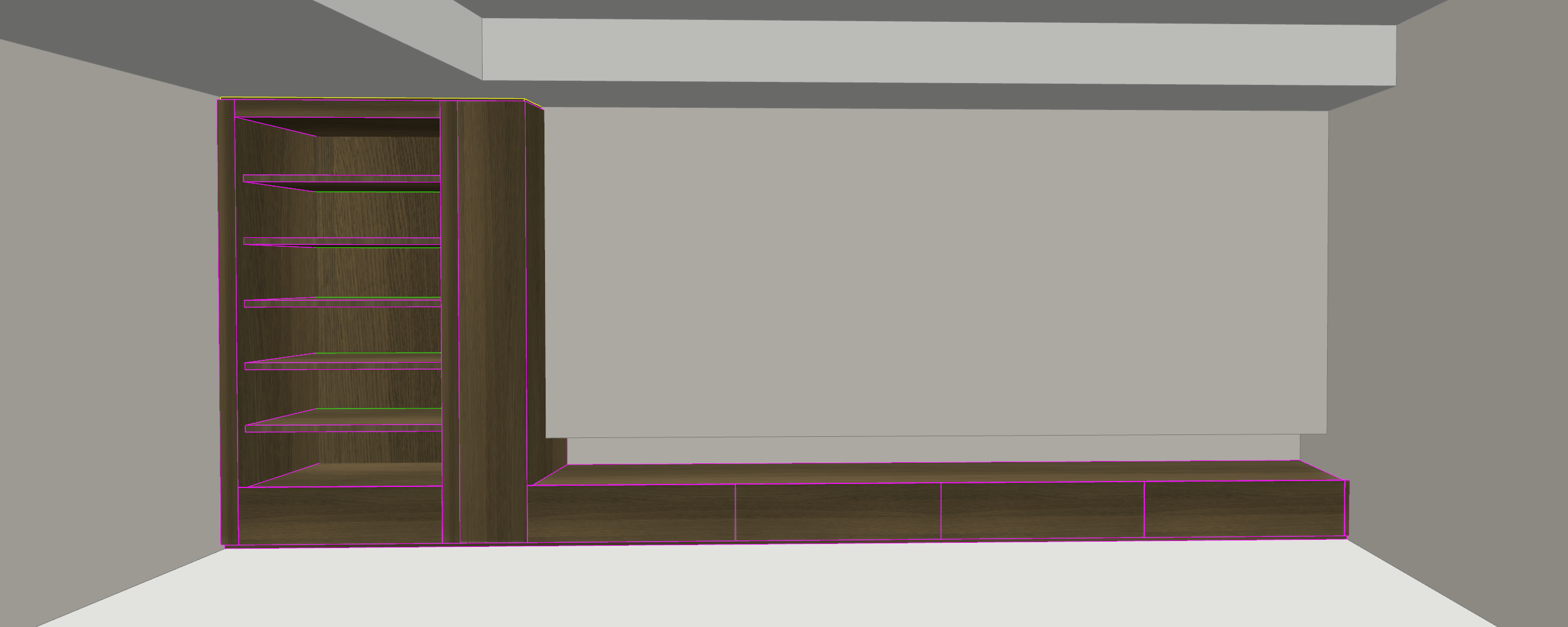 the floor should be covered with mottled beige carpet there should be a projector tv cinema screen on the wall led lighting in the niches and the overall lighting should be dim
