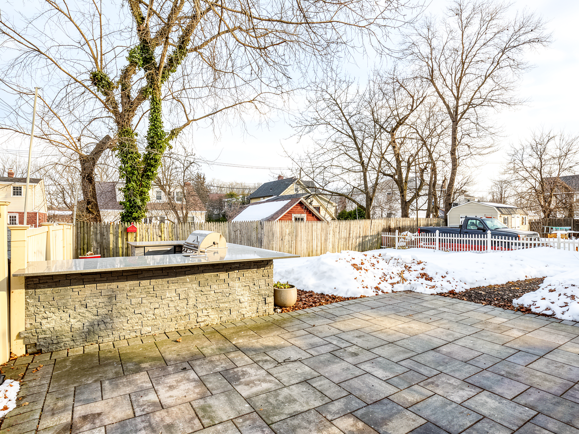 add a built in herb garden at the corner of the terrace featuring a low masonry border made of natural stone or light colored brick the raised bed should be approximately 40 50 cm high with clean modern curved lines that complement the terrace design fill the herb garden with lush healthy mediterranean herbs such as rosemary thyme basil sage and lavender ensure the masonry matches or harmonizes with the terrace flooring in tone and texture the planting should look full and vibrant with a mix of green and soft purple tones for a natural yet styled appearance