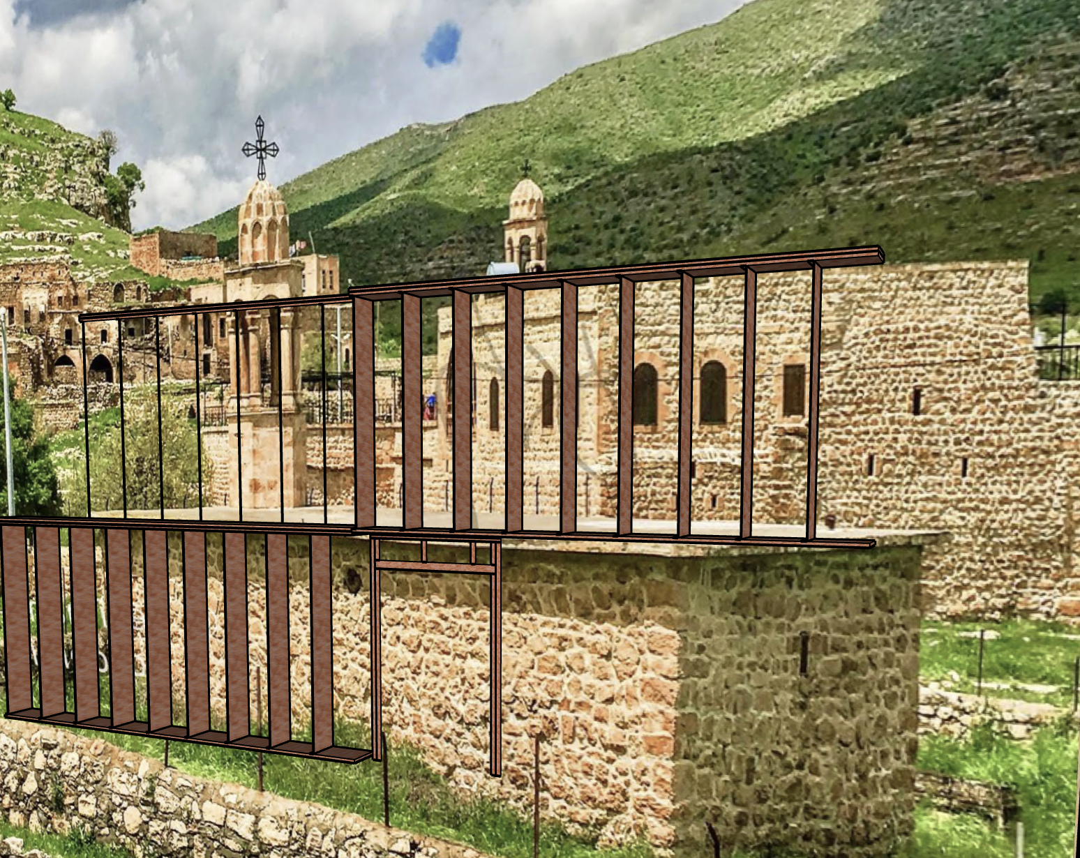high tech exterior shot old ruins corten steel bars and ramps architecture