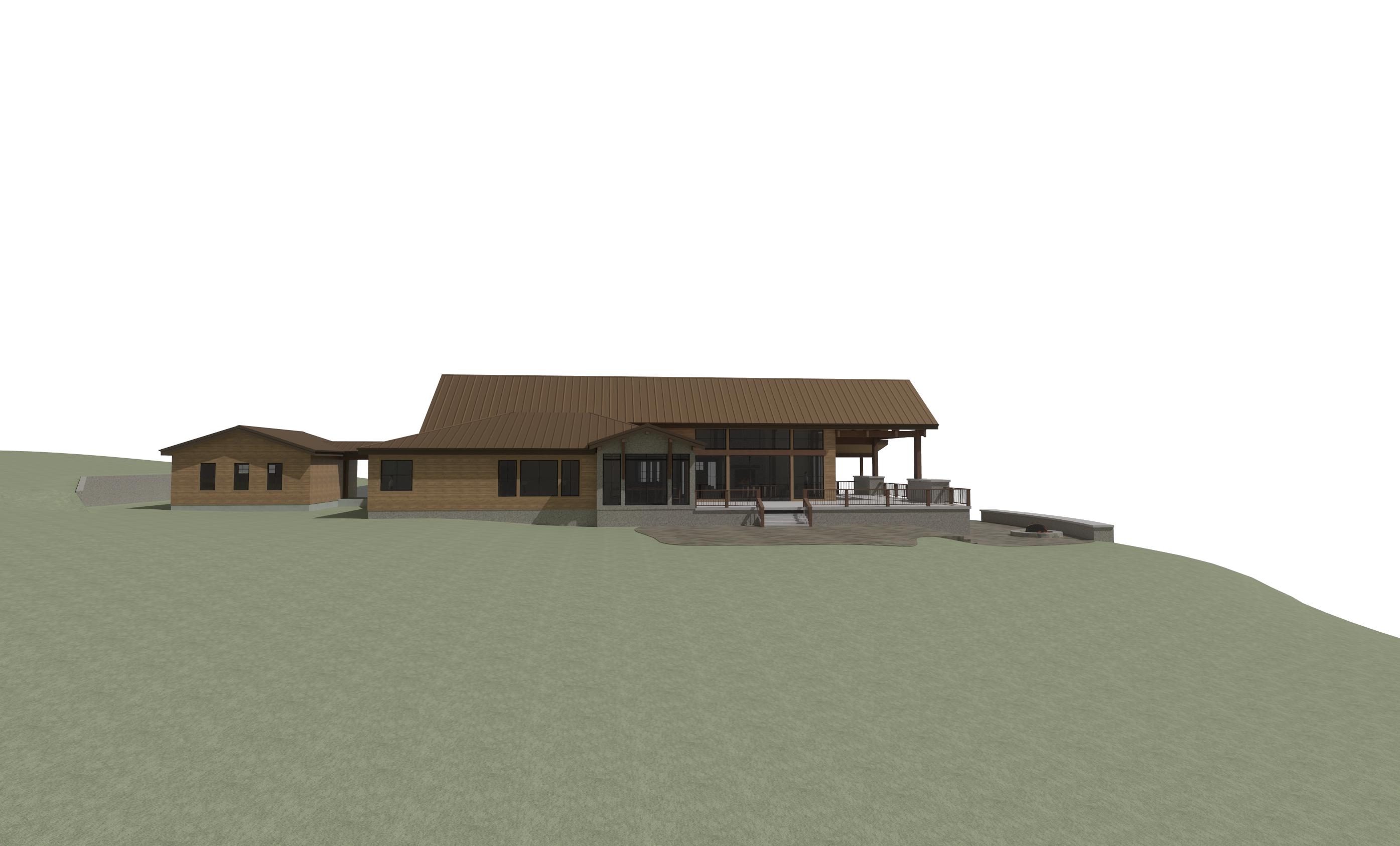 strict geometry lock prompt critical non negotiable geometry lock use the input image as a fixed reference the architecture must remain identical do not add remove or modify any elements do not change any windows or doors in any way do not replace resize move or redesign windows or doors do not add features such as fireplaces trim changes or new openings do not alter rooflines walls structure or proportions if unsure keep the original exactly as is the absolute most important thing is do not change the shape of the structure or window or door sizes the most important thing is to not change the size of the house in anyway create a realistic elevation of the architectural design maintaining the original materials of lap siding in their correct locations enhance the lighting and shadows for a lifelike effect but ensure that the texture and arrangement of both siding types remain exactly as in the original design make sure to keep the rock on the walls the same make wood siding ghost wood like jackson hole but leave the rock siding dont change the rock siding just make it more realistic keep lap siding horizantal do not make any siding vertical make the roof new metal copper roof this in montana use native montana trees and vegetation make golden hour outside show golden light coming from inside the absolute most important thing is do not change the shape of the structure or window or door sizes the most important thing is to not change the size of the house in anyway there is rock slab patio on front and it steps down to the right of porch the background is and open field with montana trees far off in distance only trees far off in distance the hill on the left slopes up slightly the hill on the right slopes down add firepit with realistic fire to patio add trees far off in distance make small mountain far off in distance to the right patio should wrap all the way around to front of deck the patio to the right should go all the way to the far back corner of the upper deck also dont change corbels or timbers again the most important thing is to not change the building shape windows or doors keep the same shape dont change lines in windows or doors the small gable bumpout with corbels keep rock siding all the way up on entire wall