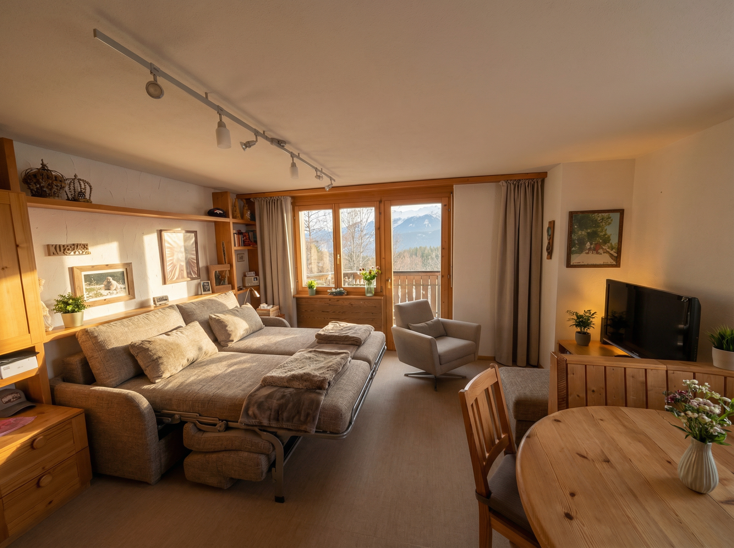 wohnzimmer komplett im alpenchic gestalten komplett neuer look alle m bel ersetzen ganzes fenster mit altholz ausstatten optimal ausleuchten decke weissputz boden neu linke seite modernes loungesofa rechte seite esstisch mit granittisch aus valser granit ersetzen