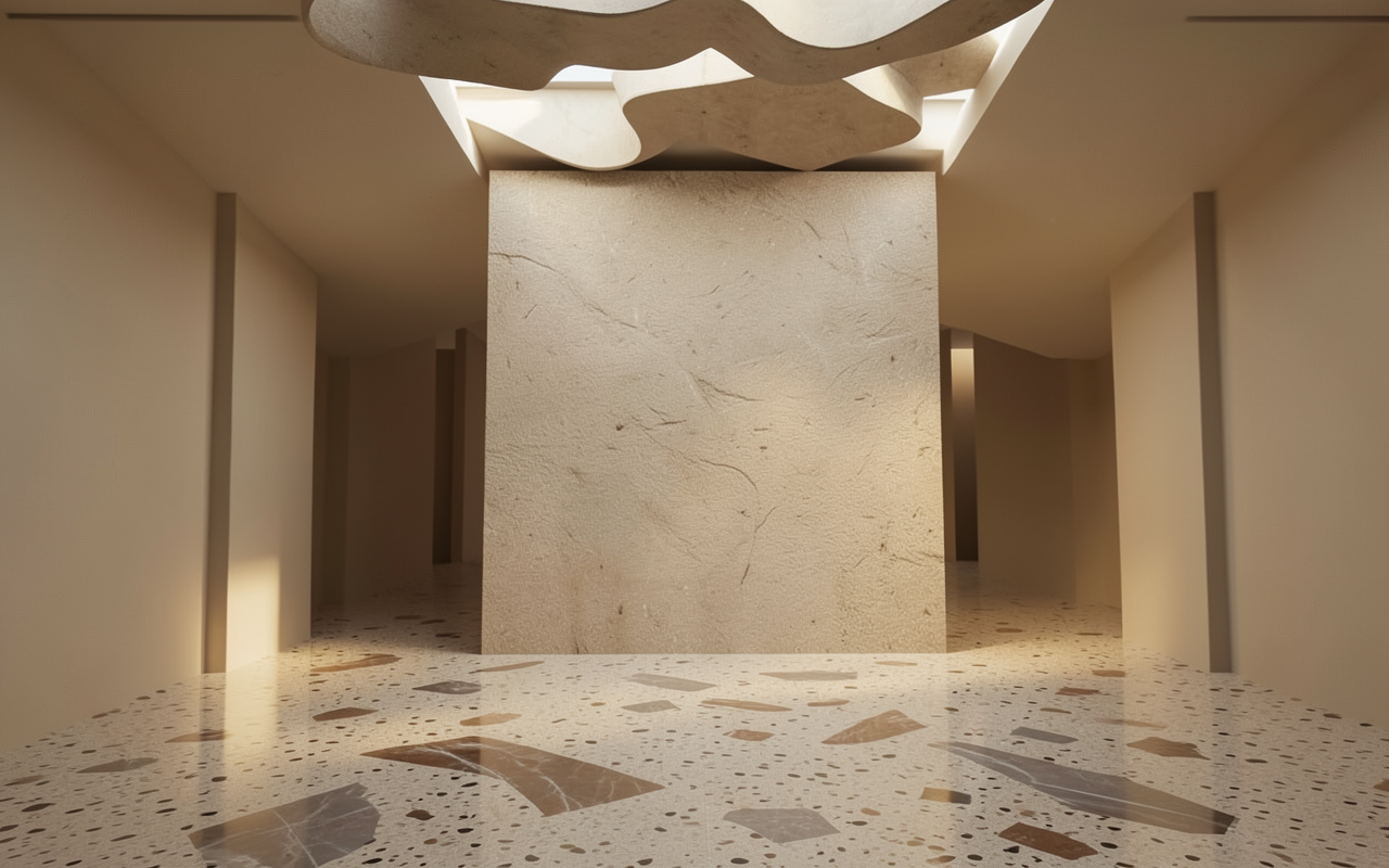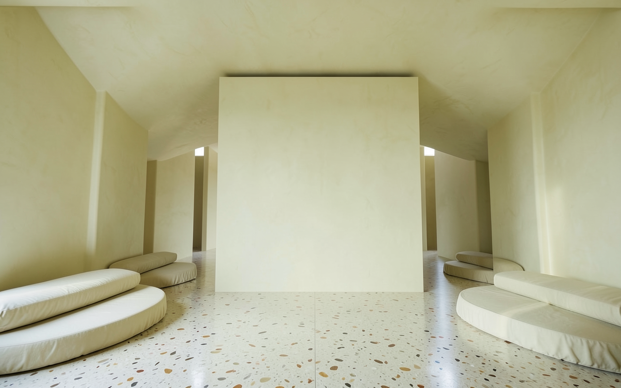 monumental meditation hall 20 foot central wall cathedral scale interior vast empty space minimal architecture organic terrazzo floor warm plaster walls soft daylight if seating is present very low small minimal far from camera visually secondary wide angle architectural photography emphasize monumental scale and architectural purity