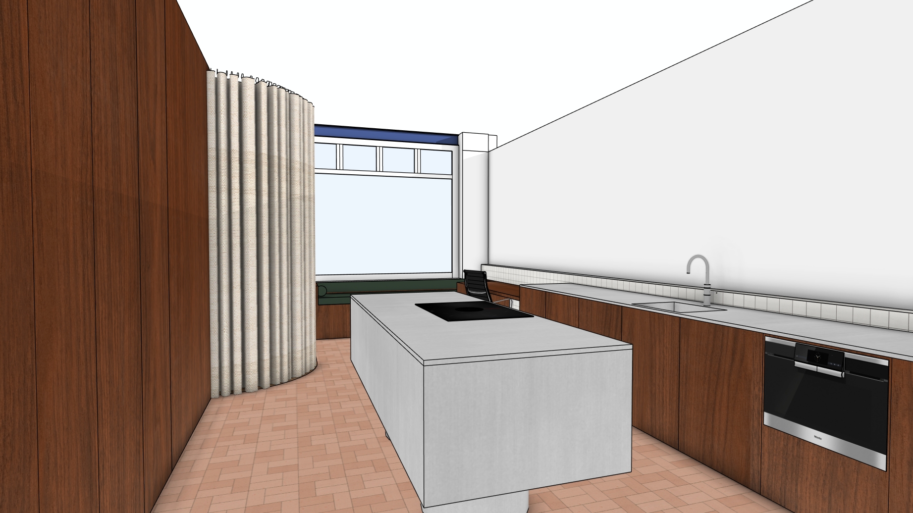 render a modern kitchen with a serene atmosphere use rich walnut brown for the walls and cabinetry complementing the elegant cream hue of the curved curtain the island in the center should have a sleek silver metallic finish the kitchen cabinets and countertop on the right should have a stainless steel finnish the floor is a warm terracotta tile evoking a cozy ambiance the window displays a soft muted sky blue capturing a calming natural light incorporate a glossy black stove on the island and a contemporary chrome faucet on the countertop the overall atmosphere should be inviting and stylishly sophisticated