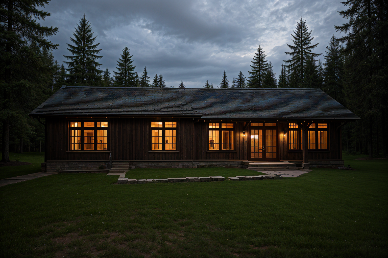 gray cedar shingle siding gray trim to match dark gray shingle roof modern landscape in front of house dark window trim and mullions modern stone base on house lake shore in foreground afternoon sky and southern pine forest in background brighter light from windows and doors add glass to doors with mullions that match windows make windows brighter gray cedar shingle siding gray trim to match