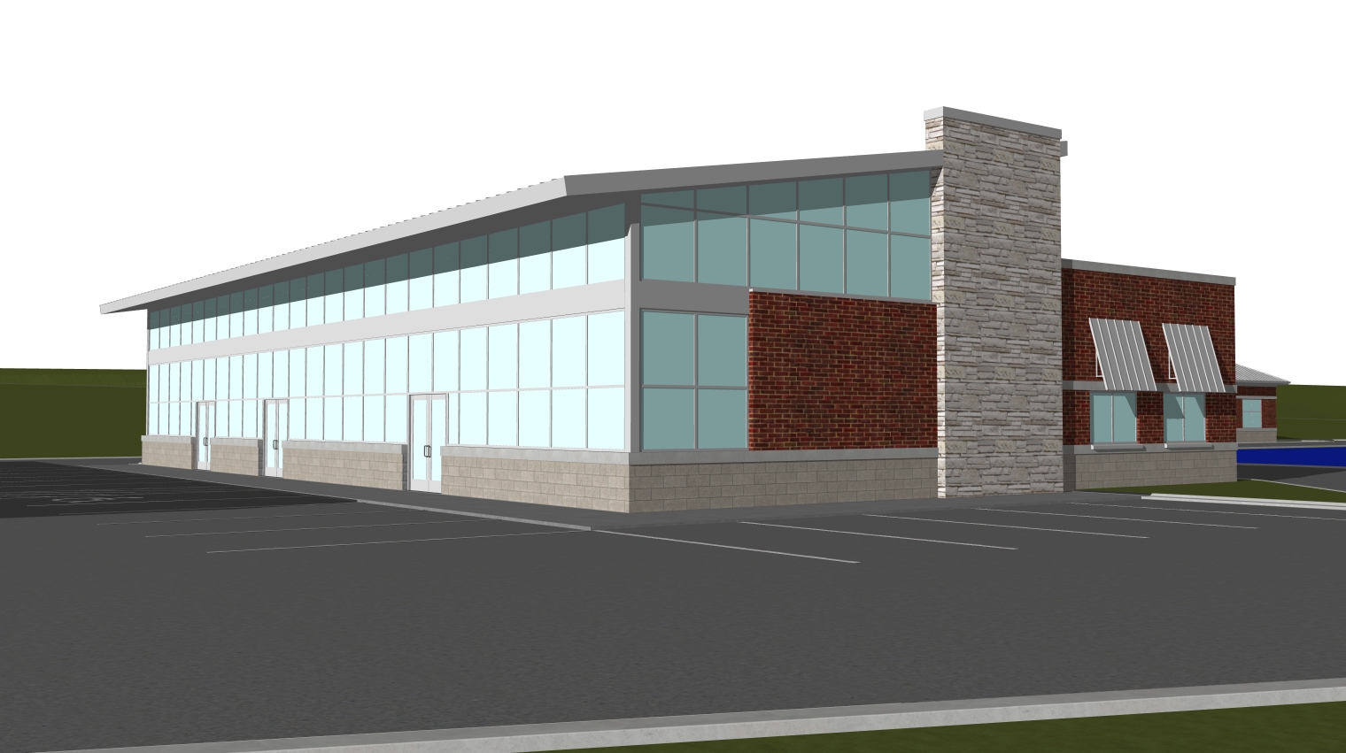 contemporary perspective shot render an elegant modern building with a sleek design featuring large windows with a soft blue tint reflecting sunlight set against vibrant brown brick walls include a gray stone textured stone wall feature the building is surrounded by a smooth asphalt parking lot and lush green grass the sky is clear brightening the overall atmosphere with warm natural light architecture